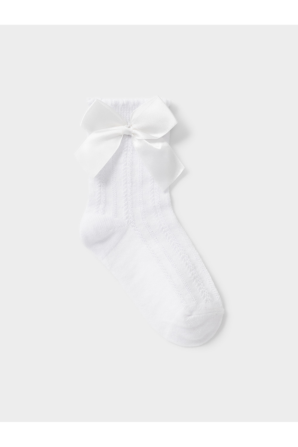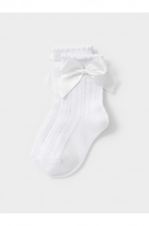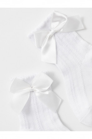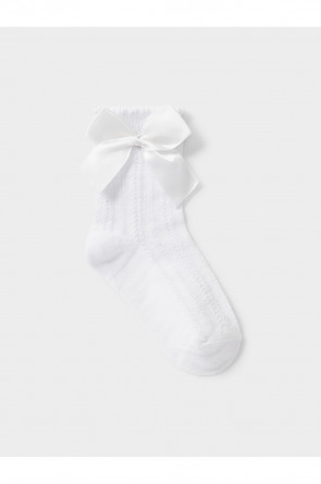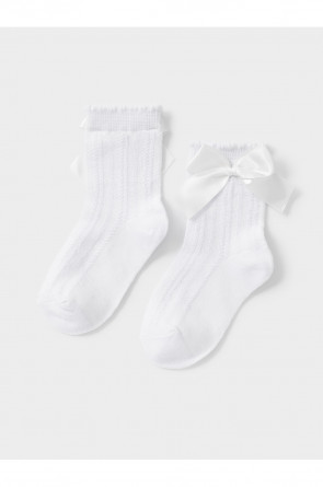 Носки длинные для девочки с формованной пяткой и эластичной резинкой по краю. Связаны ажурным узором и украшены бантиком.