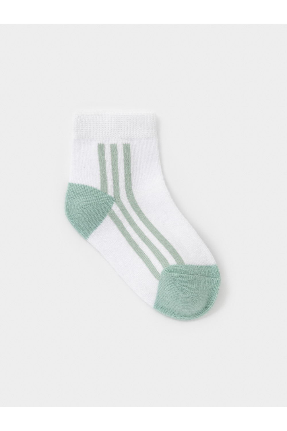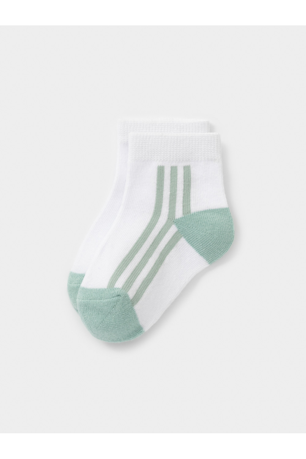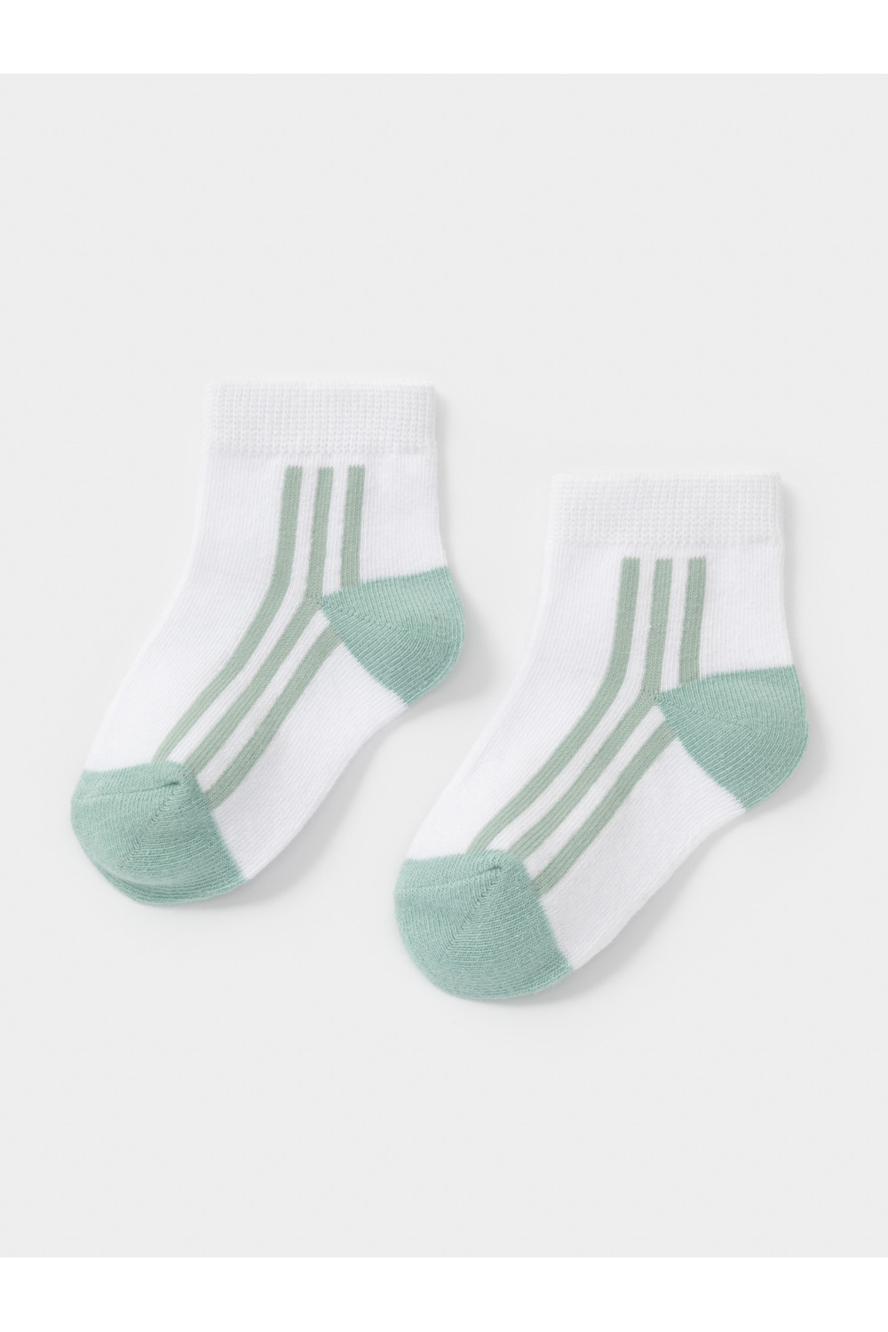 Носки короткие детские с формованной пяткой и эластичной резинкой по краю. Украшены рисунком с полосками. Изделие сохраняет форму и стойкий цвет после многочисленных стирок.