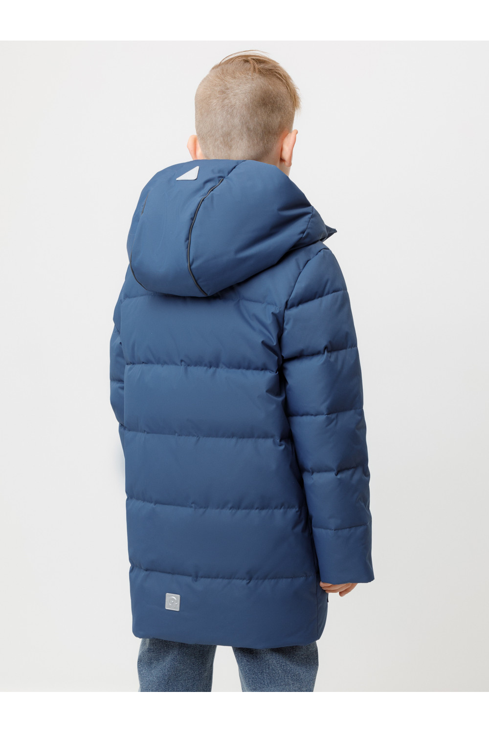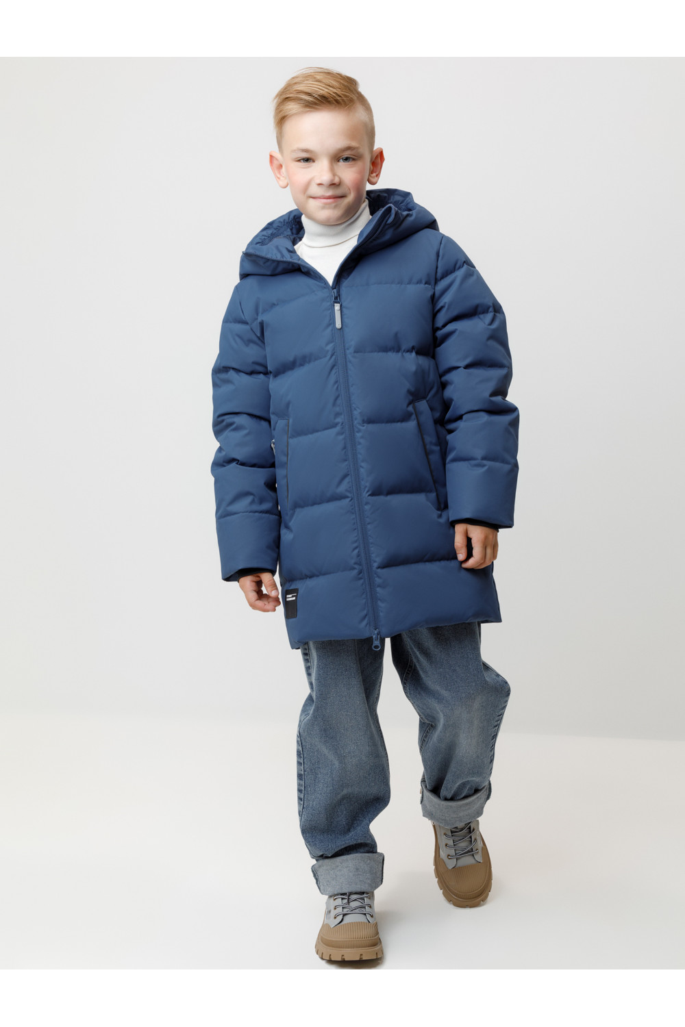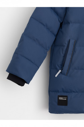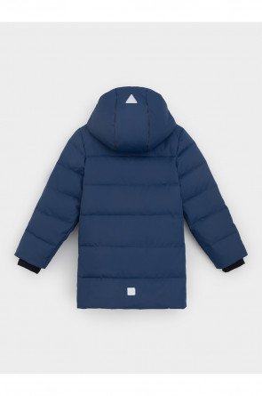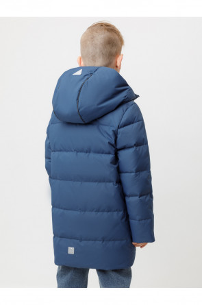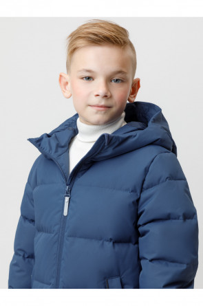 Зимнее пальто для мальчика с натуральным утеплителем из гусиного пуха (70%) и пера (30%). Выполнено из мембранной ткани с дополнительной тефлоновой обработкой, которая предохраняет изделие от загрязнений и отталкивает влагу. Подклад выполнен из 100% полиэстера. Пальто застёгивается на молнию, предусмотрена защита подбородка. Несъёмный капюшон имеет эластичные утяжки. По бокам два кармана на молнии, так же имеется внутренний карман. В рукавах мягкие внутренние манжеты. Во всех изделиях верхнего ассортимента для безопасности ребёнка предусмотрены светоотражающие элементы.
