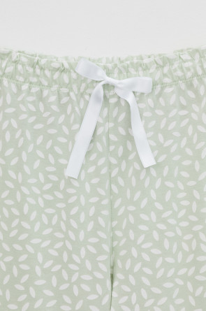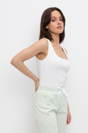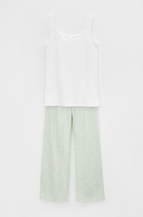 Комплект для комфортного сна из трикотажного полотна с набивным рисунком. Майка из эластичного трикотажа с добавлением лайкры в рубчик. Брюки с мягким поясом на резинке удобно садятся по фигуре. Гладкий материал приятен к телу, не теряет форму и позволяет коже дышать.