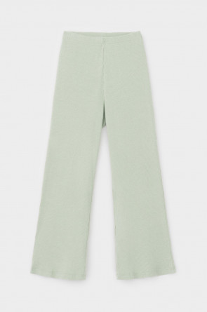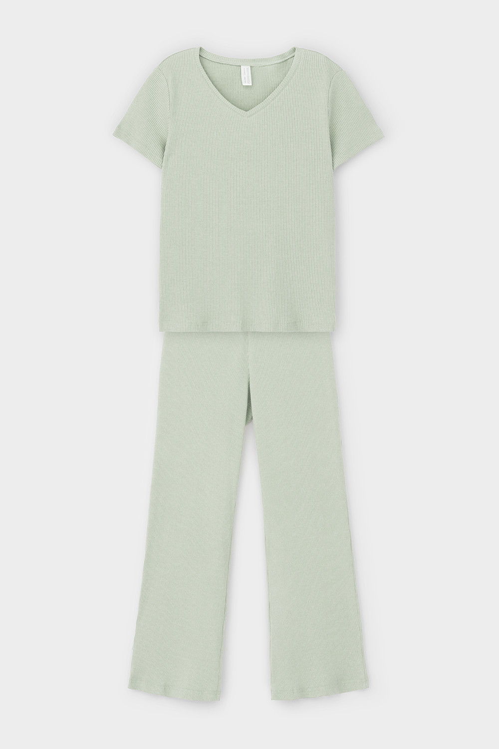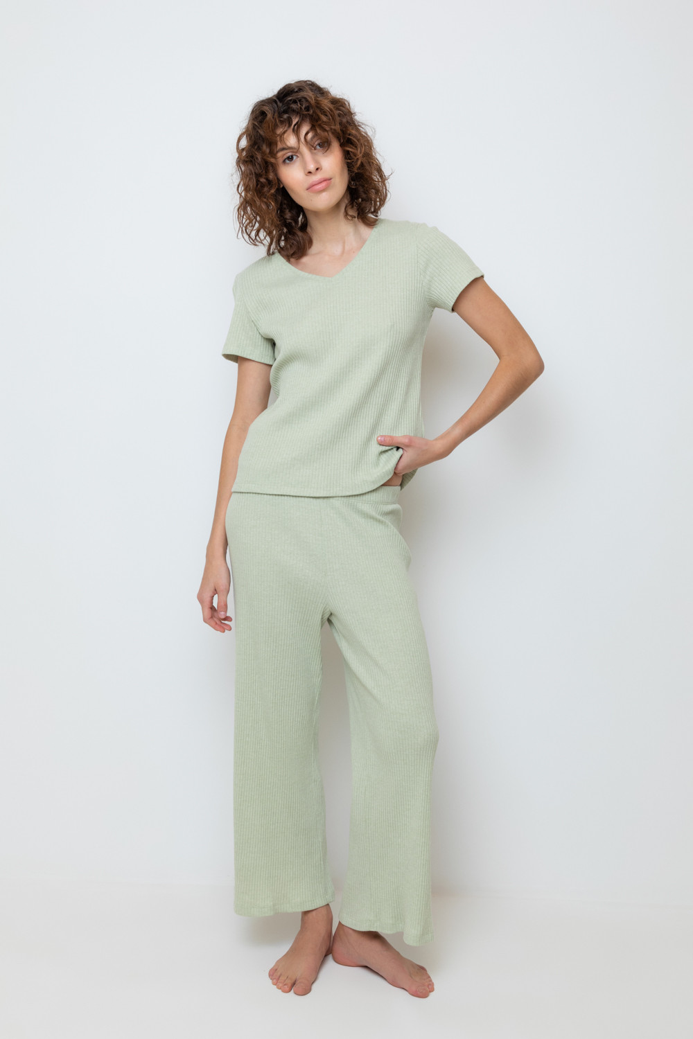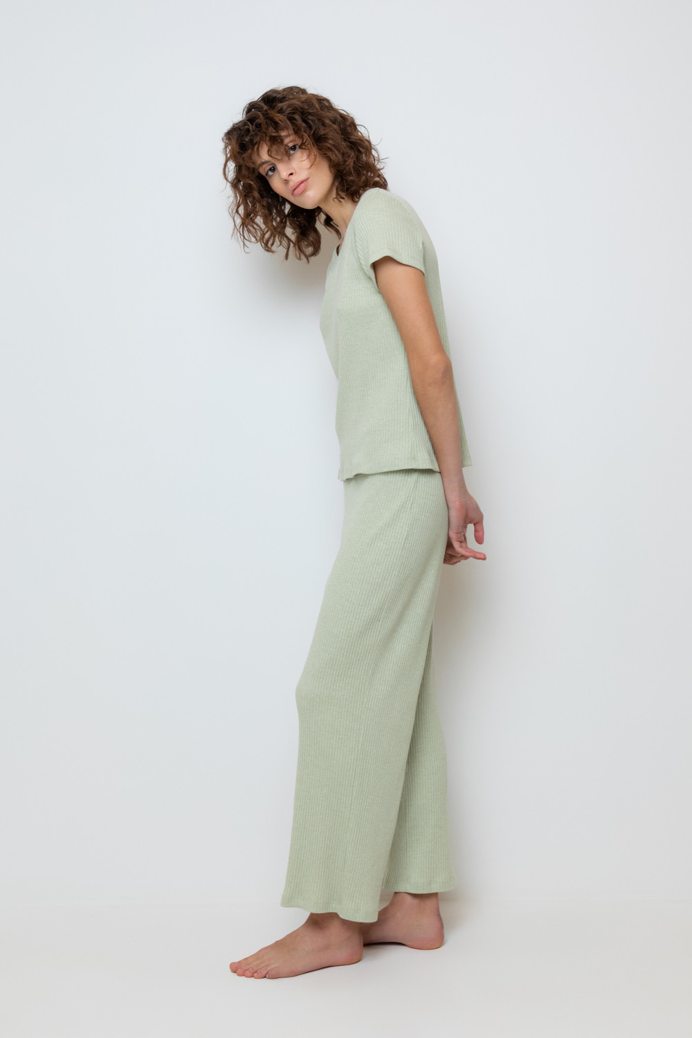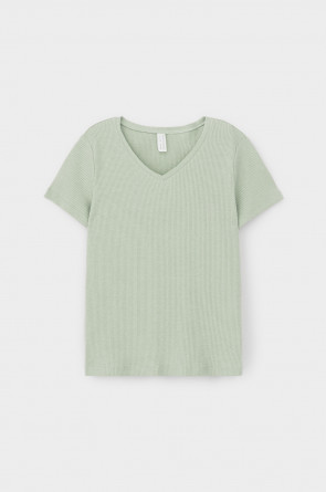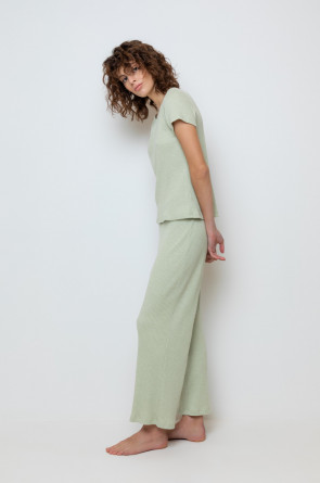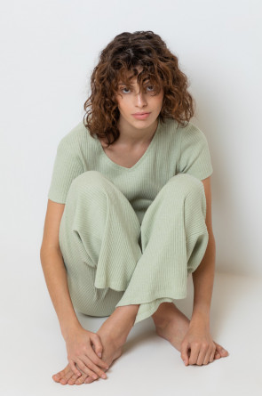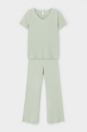 Комплект для комфортного сна из меланжевого трикотажа в рубчик. Свободная футболка с V- образным вырезом. Брюки с мягким поясом на резинке удобно садятся по фигуре. Низ футболки и брюк обработан микрооверлоком.