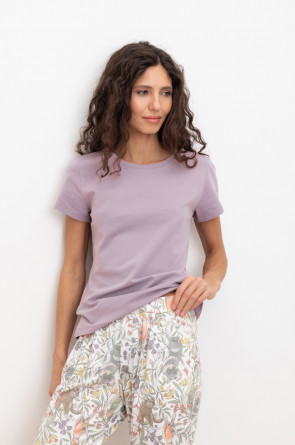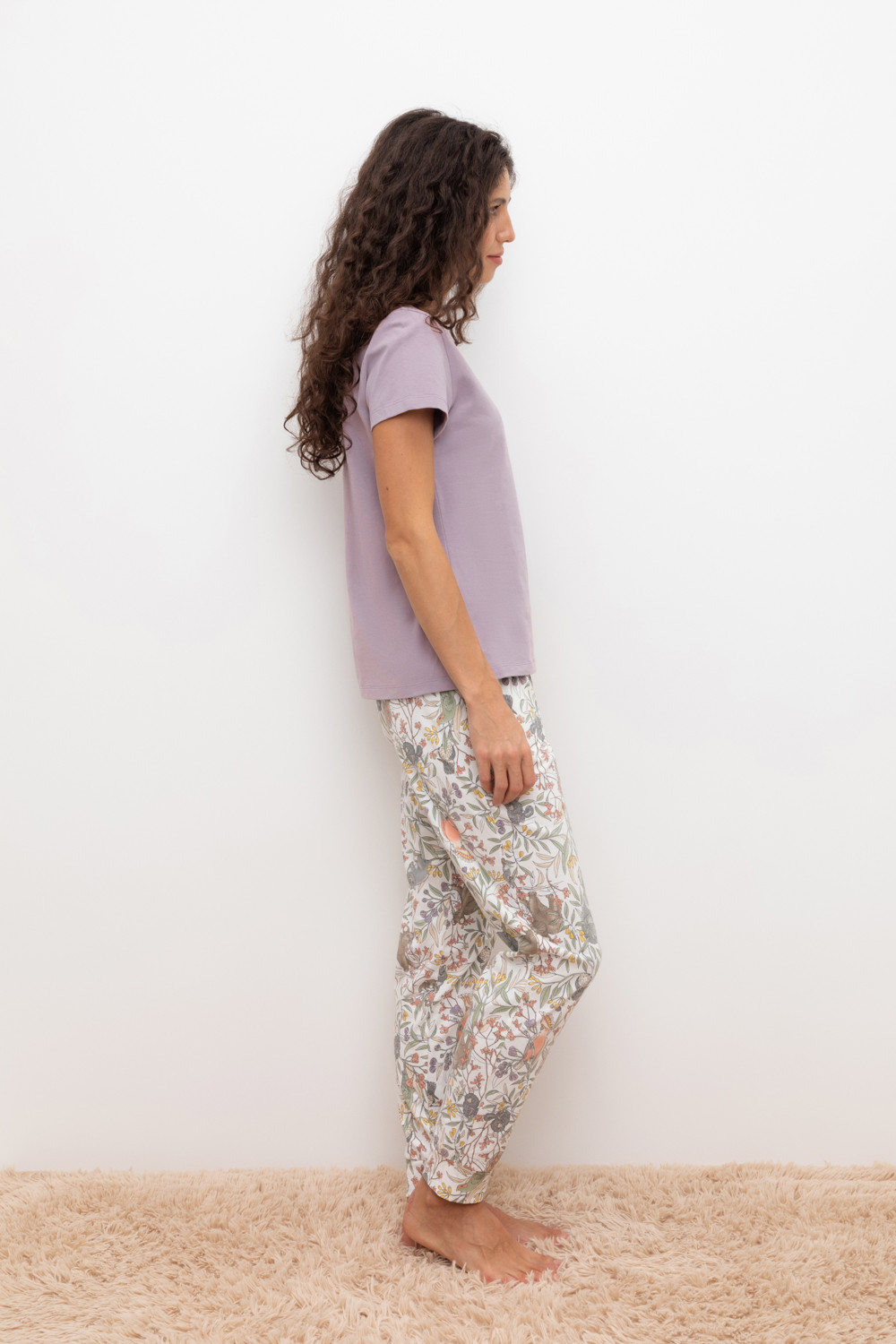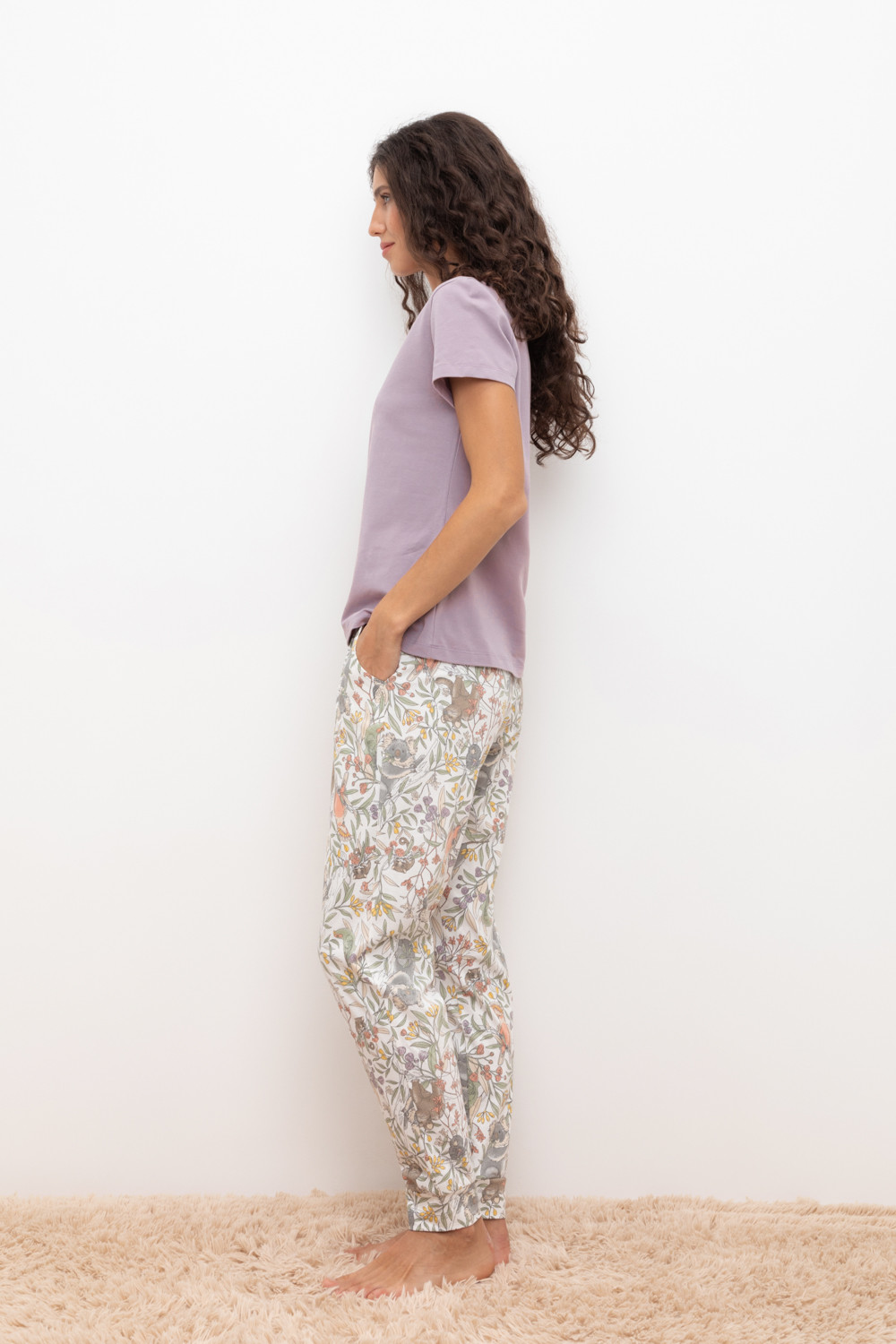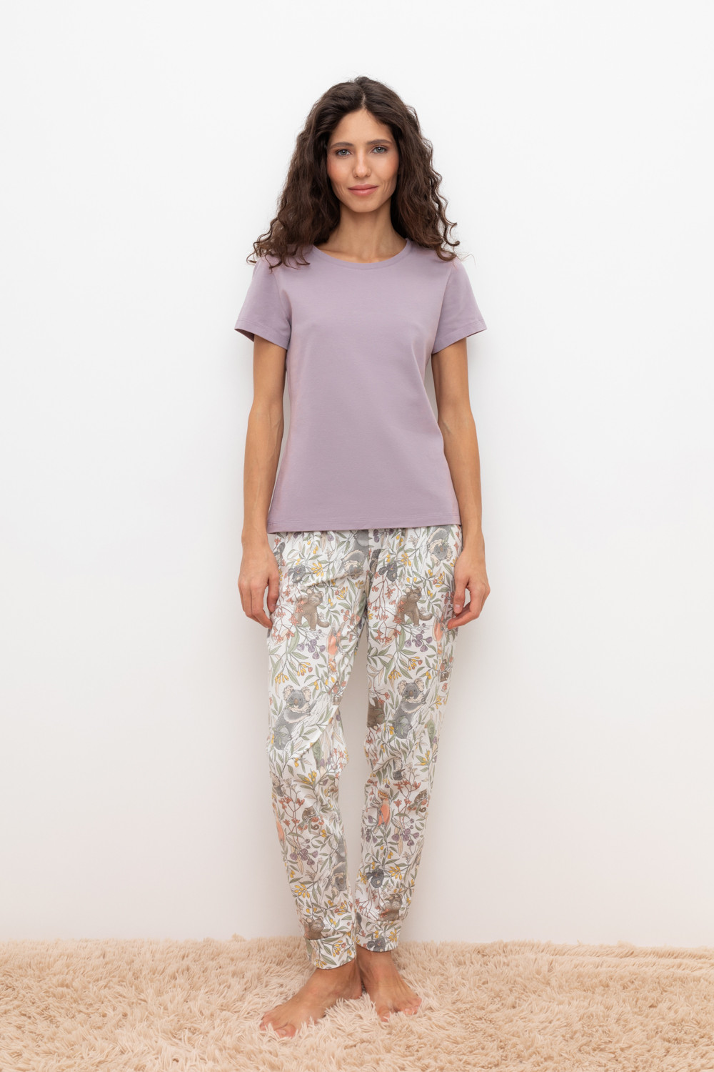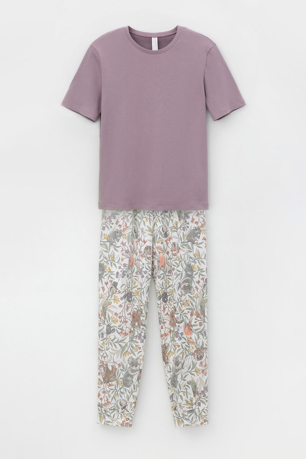 Легкий комплект для комфортного сна и отдыха. Футболка стандартной длины с короткими рукавами в рубчик. Брюки с удобными боковыми карманами и манжетами выполнены из набивного трикотажа. Гладкий материал приятен к телу и позволяет коже дышать.