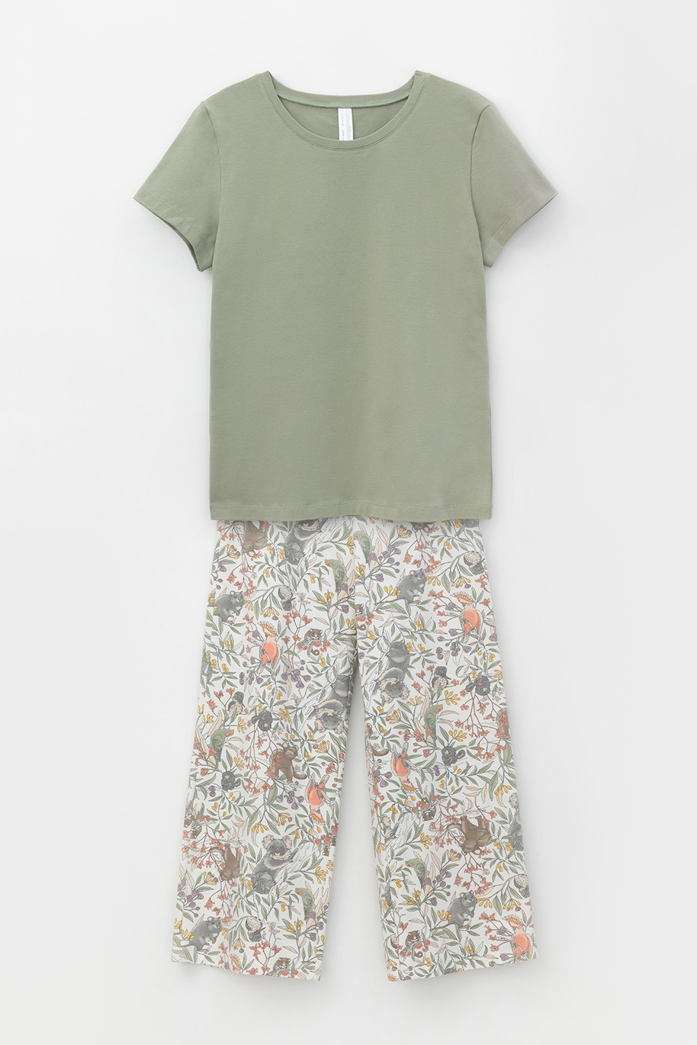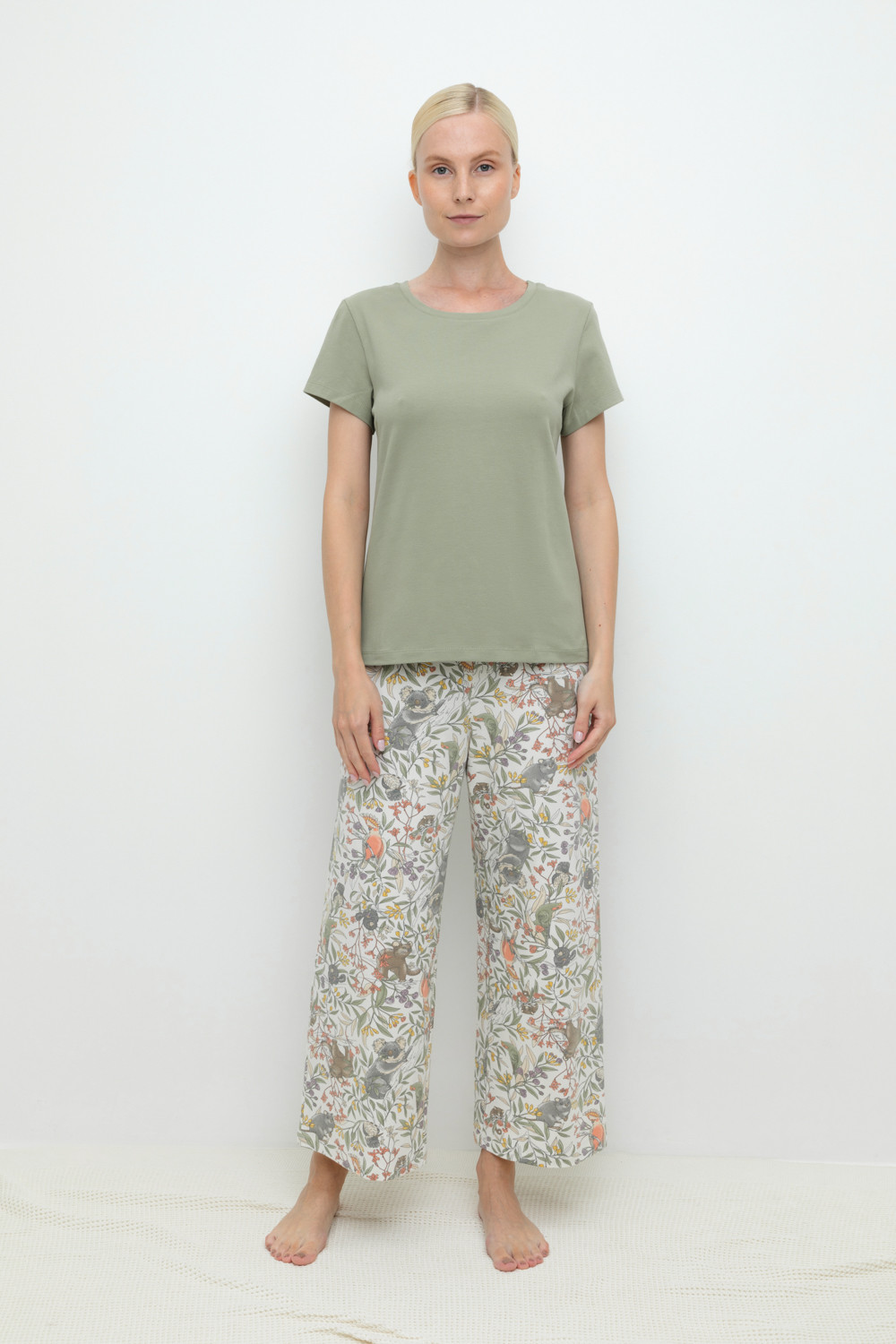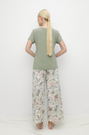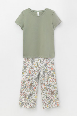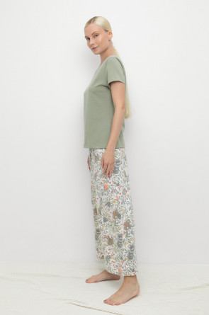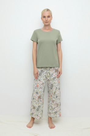 Комплект для сна и отдыха из натурального хлопка с добавлением лайкры. Футболка стандартной длины комфортно садится по фигуре. Укороченные просторные брюки из набивного трикотажа с мягким поясом на резинке.