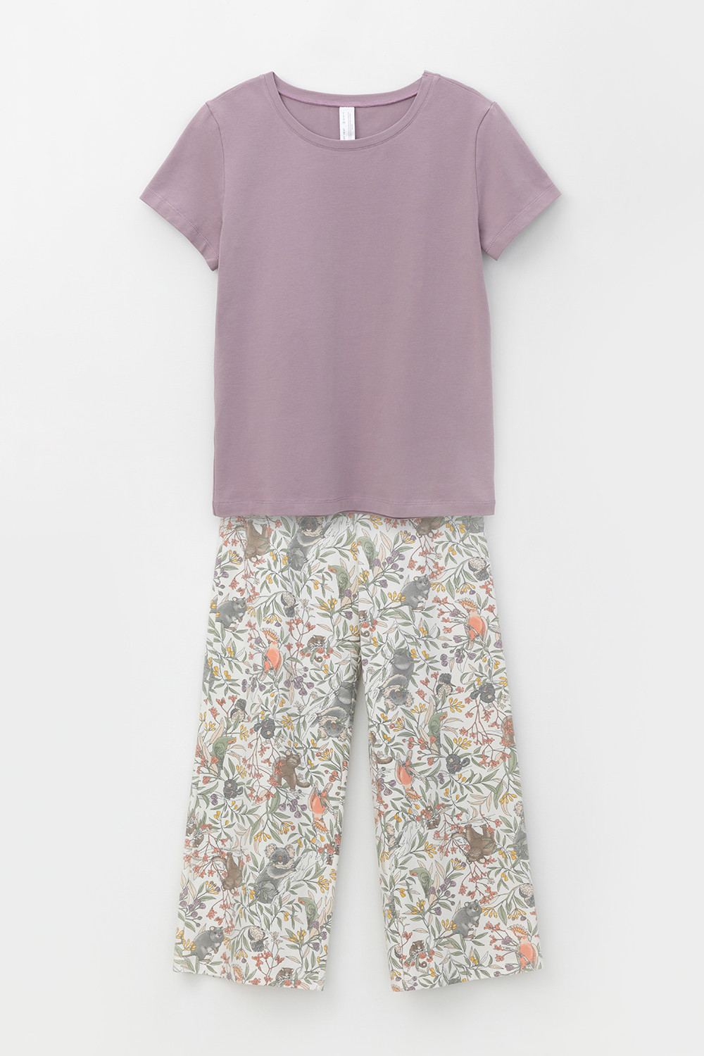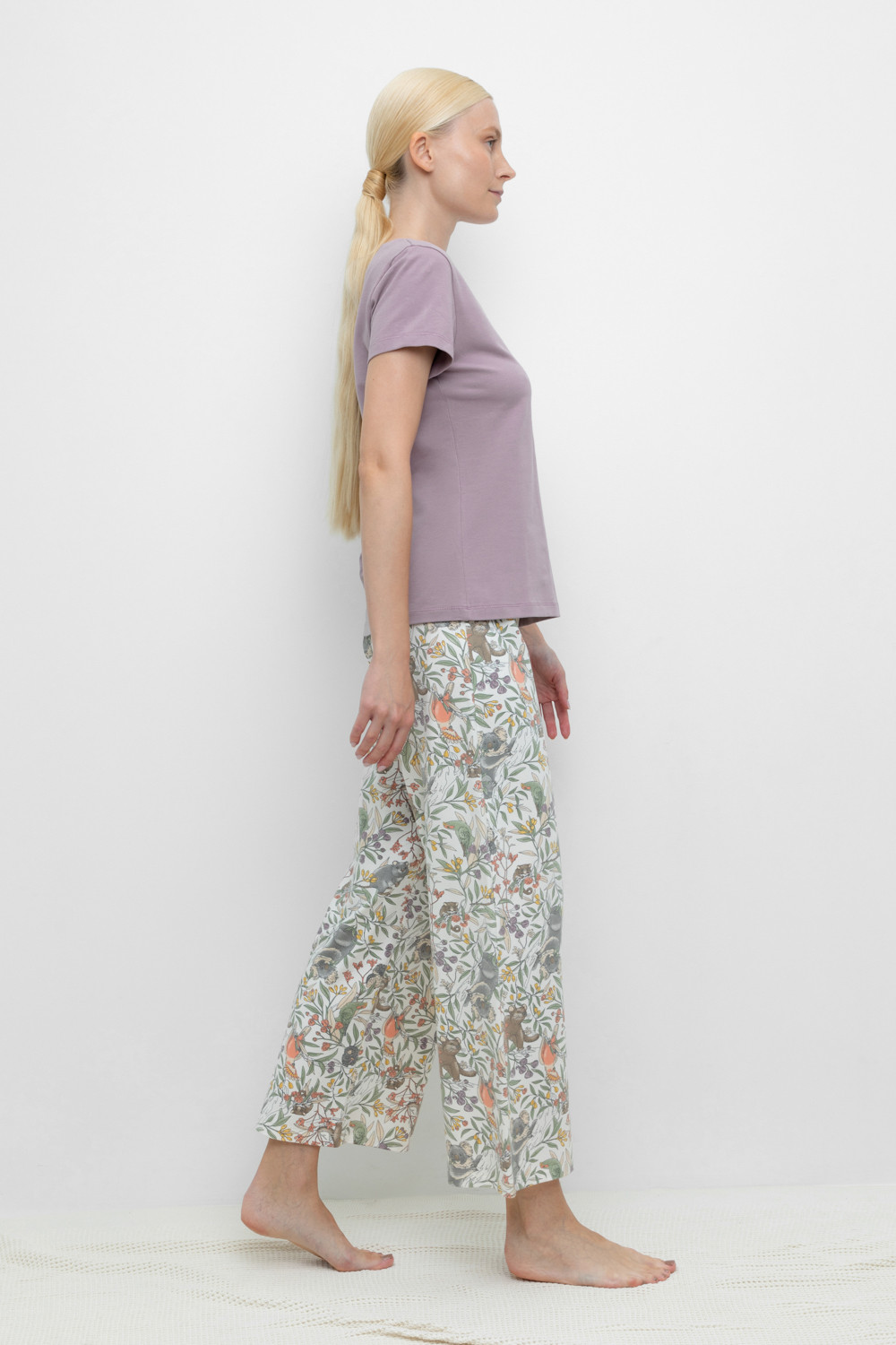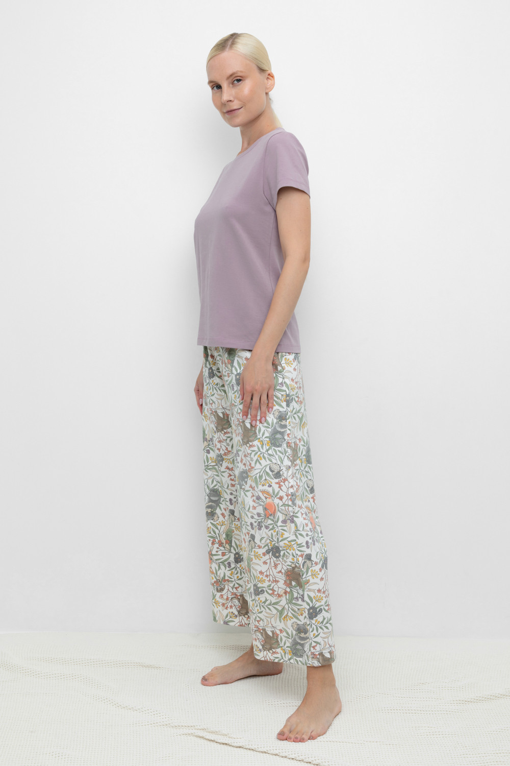 Комплект для сна и отдыха из натурального хлопка с добавлением лайкры. Футболка стандартной длины комфортно садится по фигуре. Укороченные просторные брюки из набивного трикотажа с мягким поясом на резинке.