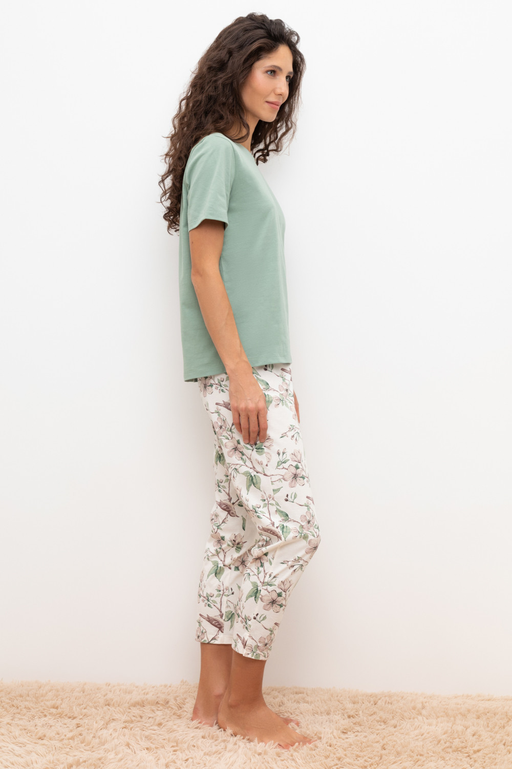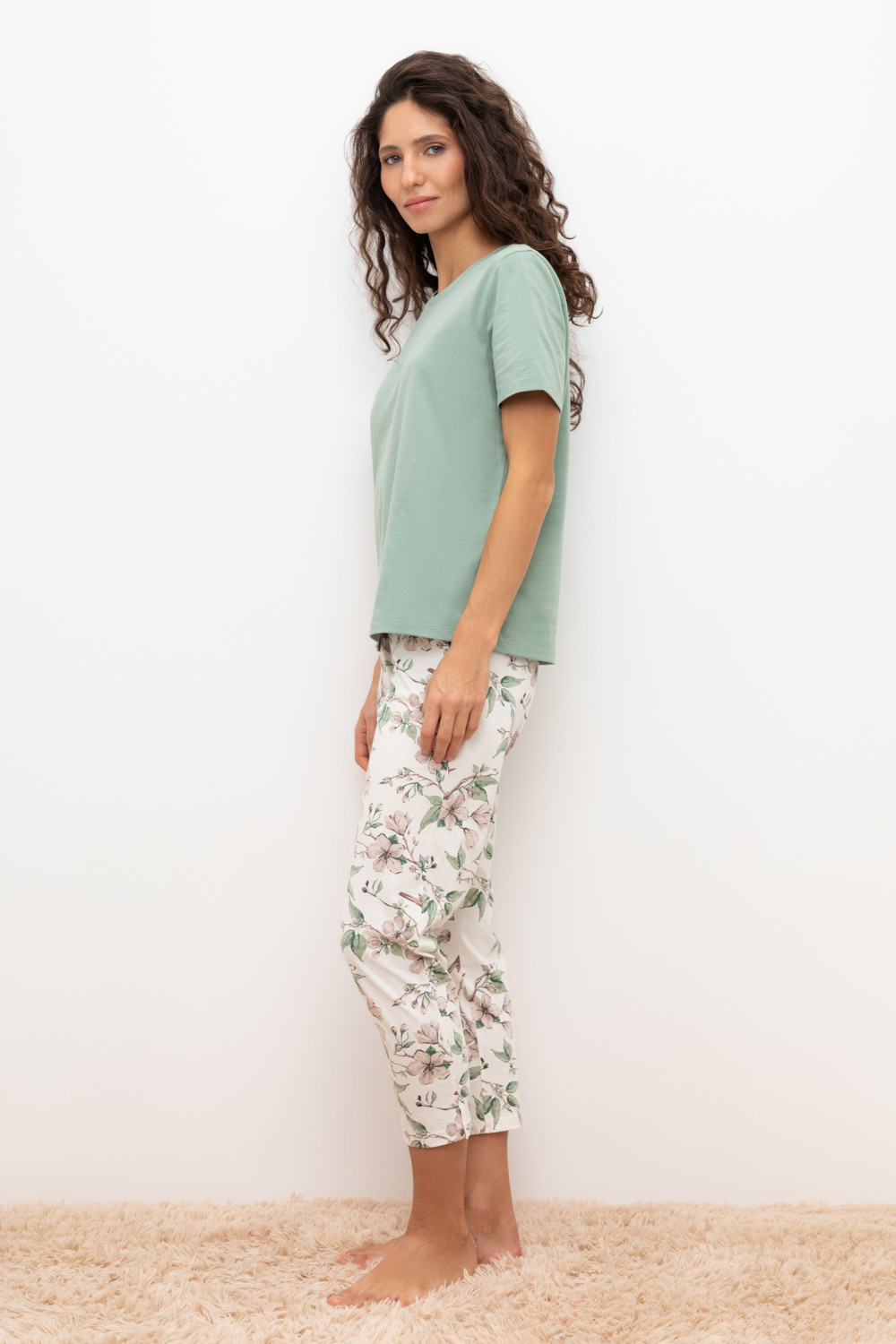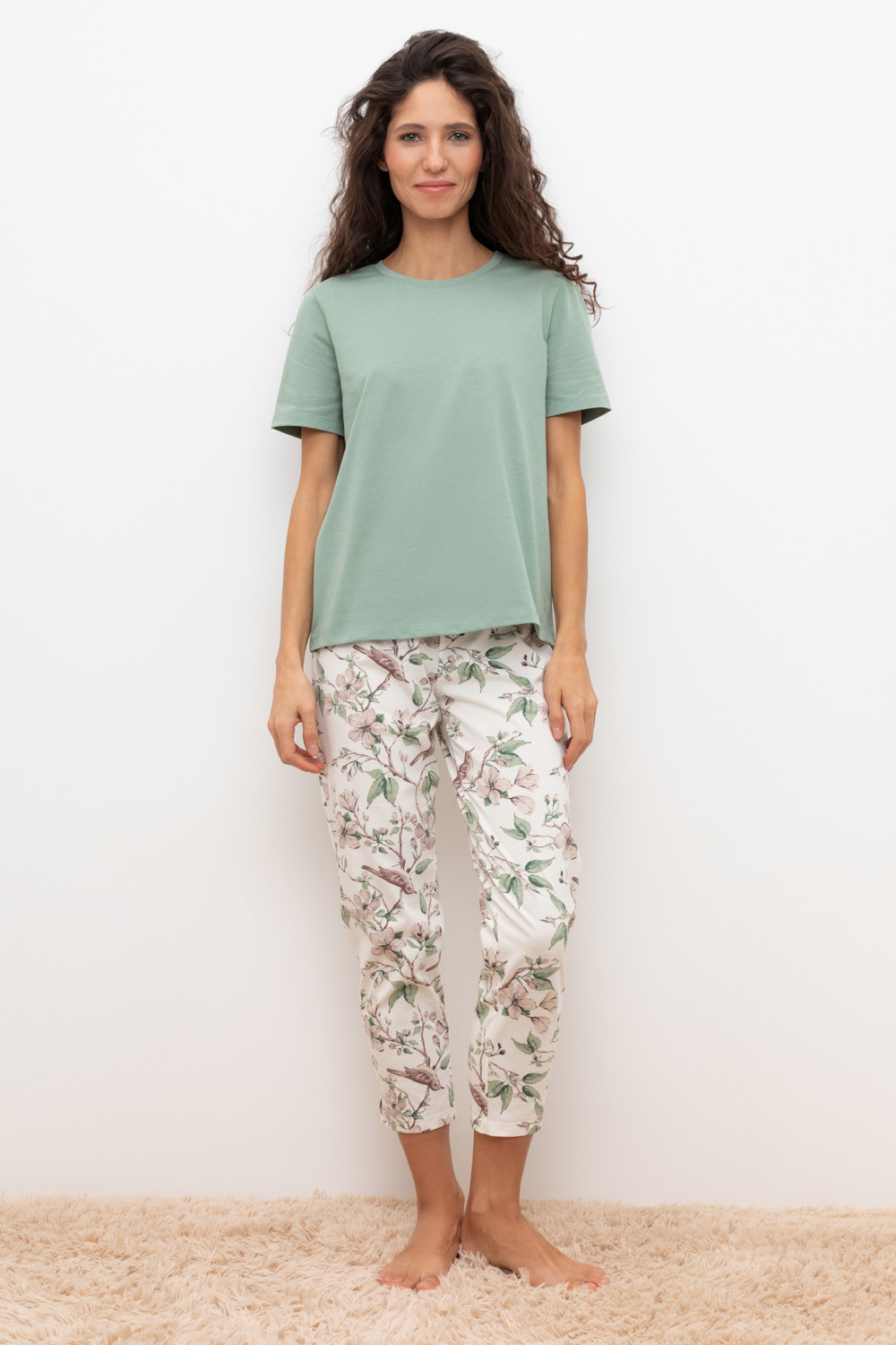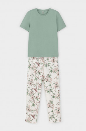 Легкий комплект для комфортного сна и отдыха. Футболка стандартной длины с короткими рукавами. Брюки с поясом на резинке и разрезами по бокам выполнены из набивного трикотажа. Гладкий материал приятен к телу и позволяет коже дышать.