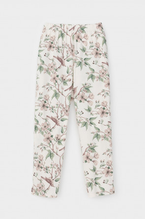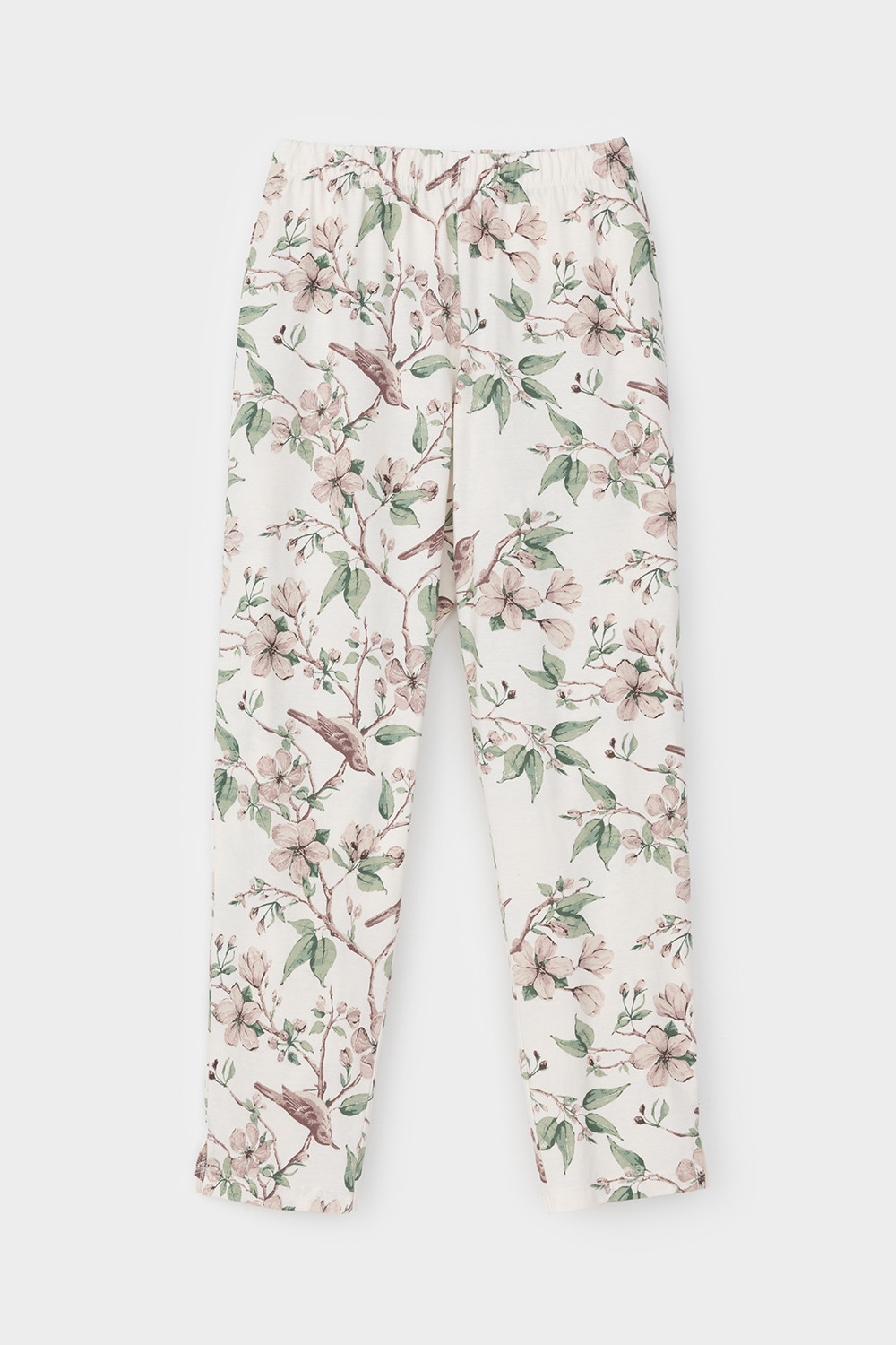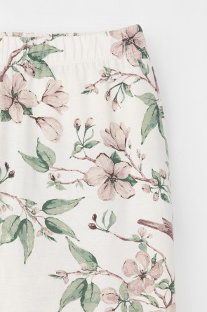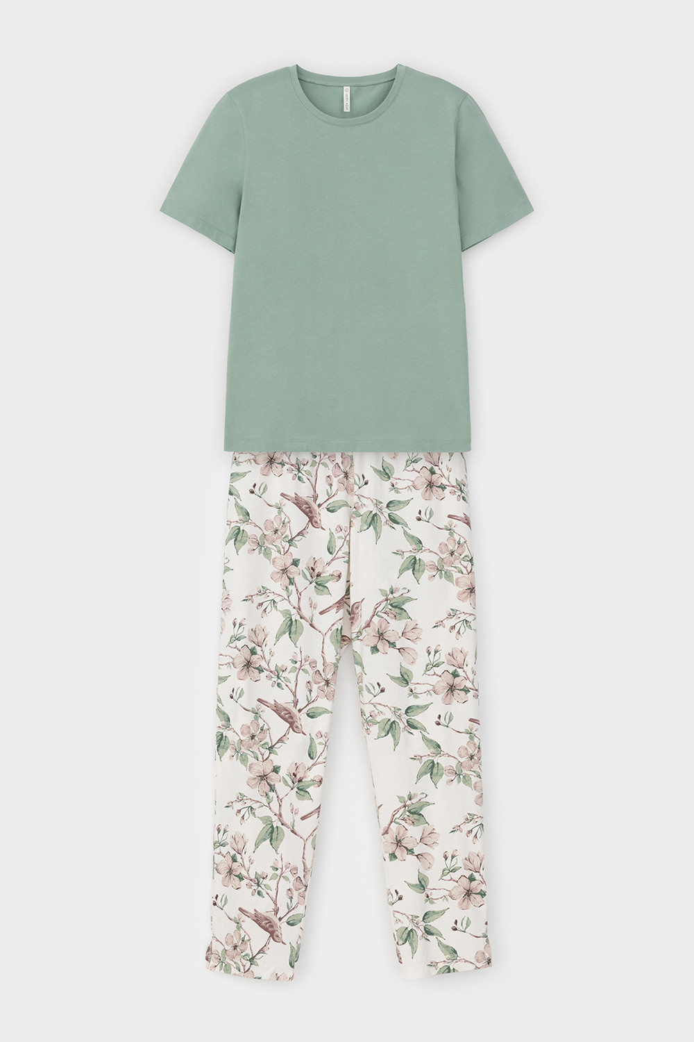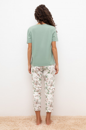 Легкий комплект для комфортного сна и отдыха. Футболка стандартной длины с короткими рукавами. Брюки с поясом на резинке и разрезами по бокам выполнены из набивного трикотажа. Гладкий материал приятен к телу и позволяет коже дышать.