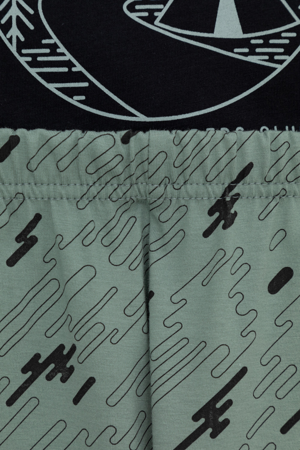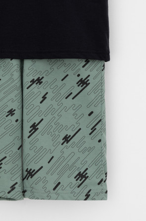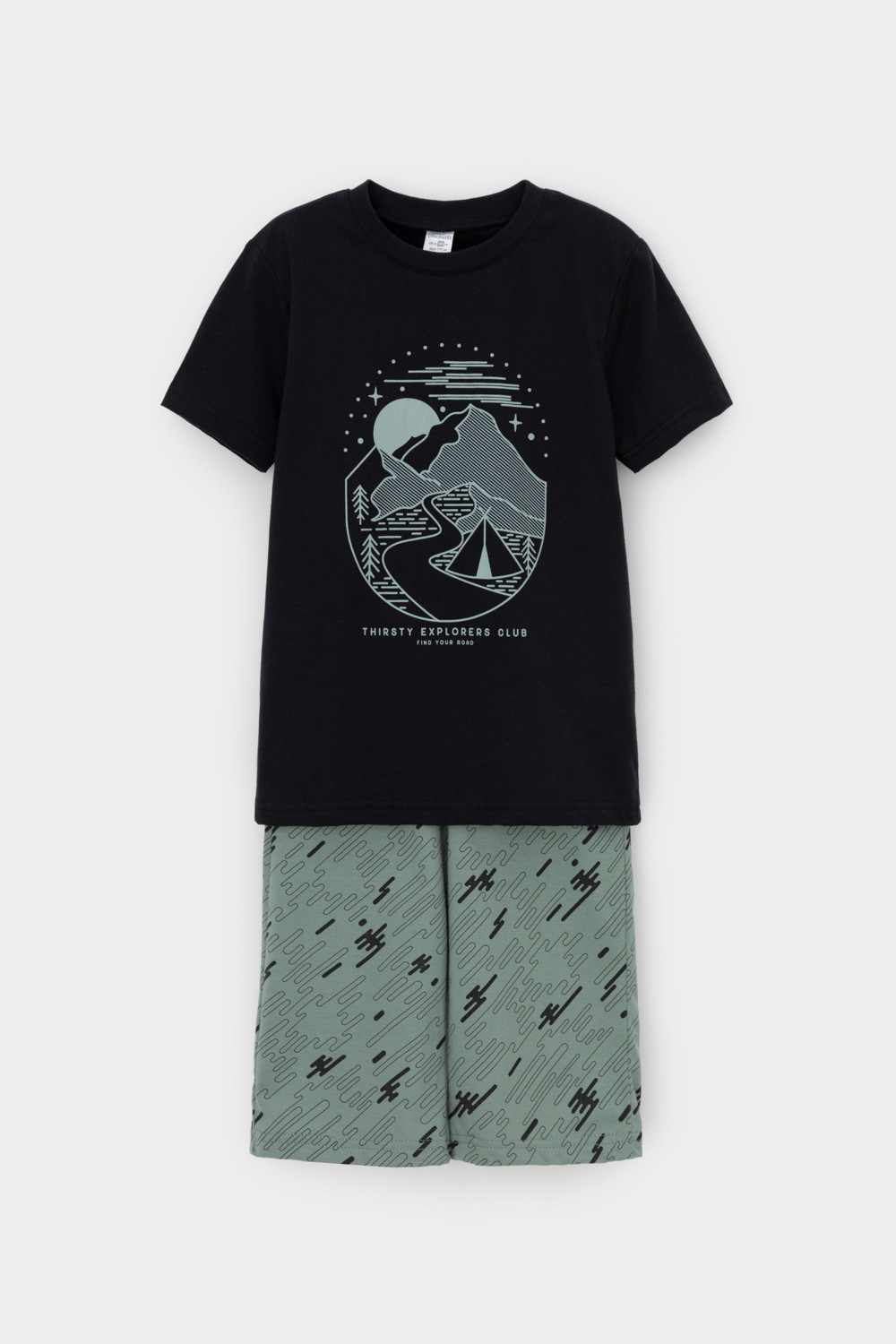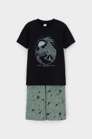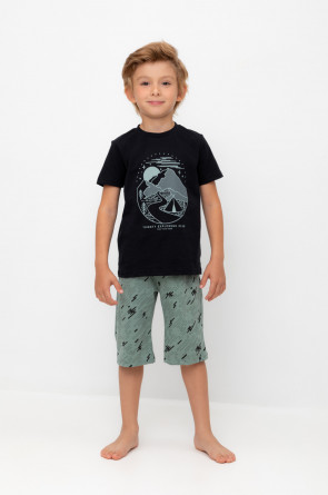 Трикотажная пижама из натурального хлопка. Футболка с короткими рукавами с принтом . У шорт эластичный пояс на резинке. Оригинальная набивка выполнена из стойких, гипоаллергенных текстильных красителей. Пижама сохраняет цвет и форму после многократных стирок. Все трикотажные полотна производятся в соответсвии с нормами Швейцарского сертификата ЭкоТекс.