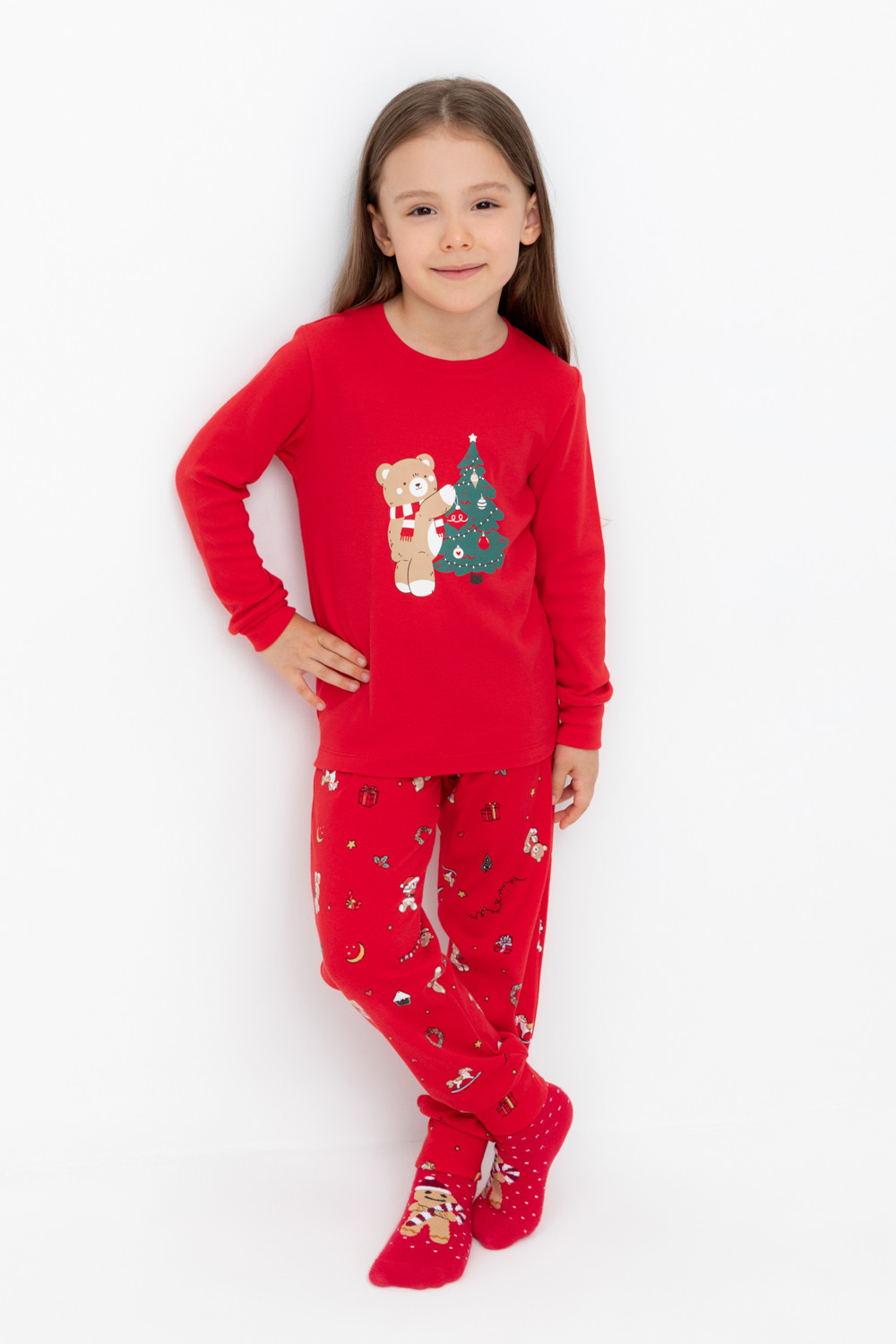 Трикотажный пижамный комплект из натурального хлопка. У джемпера длинные втачные рукава с мягкими манжетами. Брюки с удобным поясом на резинке и эластичными манжетами. Оригинальная набивка и принт выполнены из стойких, гипоаллергенных текстильных красителей. Все трикотажные полотна производятся в соответствии с нормами Швейцарского сертификата ЭкоТекс.