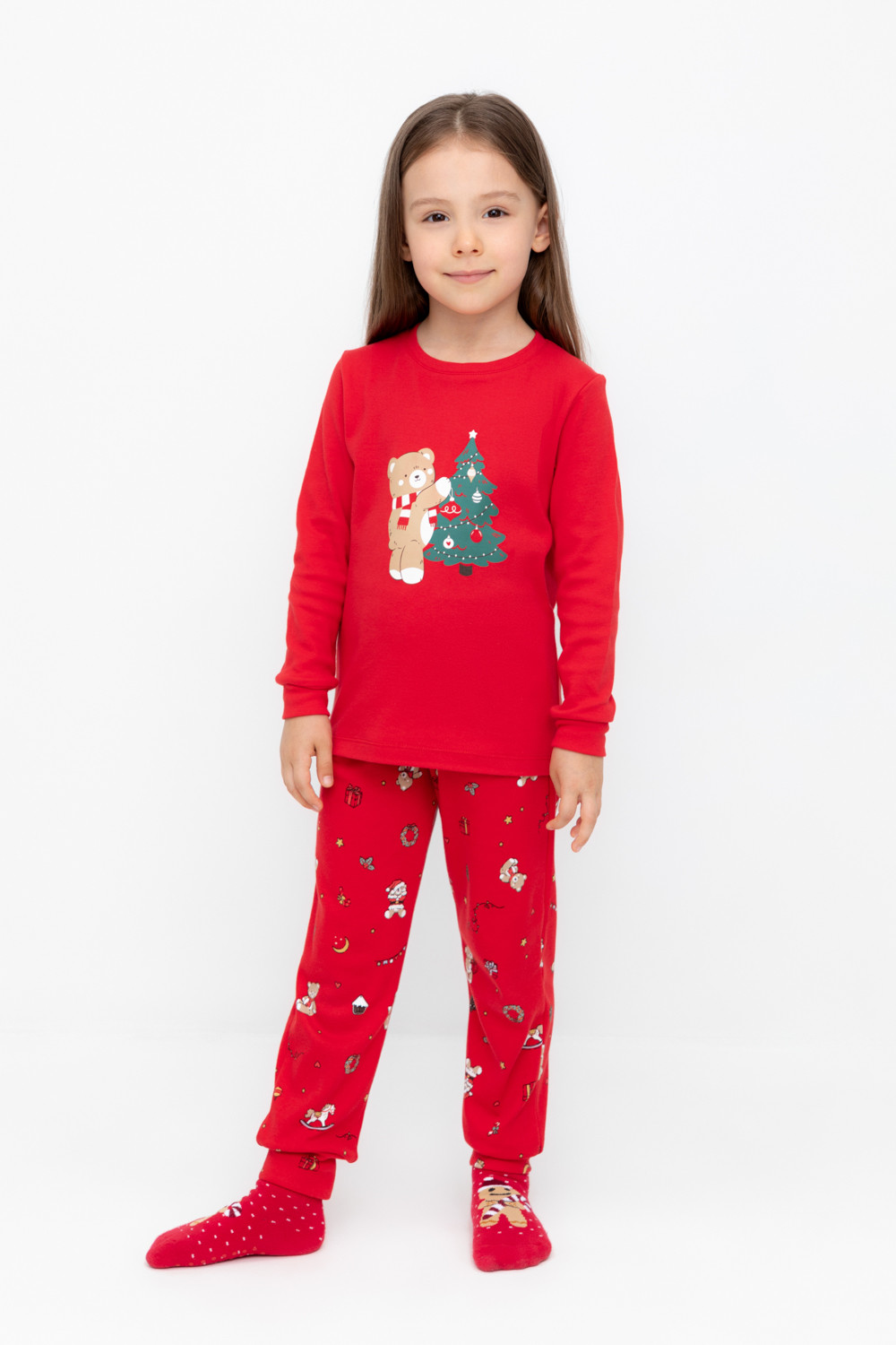 Трикотажный пижамный комплект из натурального хлопка. У джемпера длинные втачные рукава с мягкими манжетами. Брюки с удобным поясом на резинке и эластичными манжетами. Оригинальная набивка и принт выполнены из стойких, гипоаллергенных текстильных красителей. Все трикотажные полотна производятся в соответствии с нормами Швейцарского сертификата ЭкоТекс.