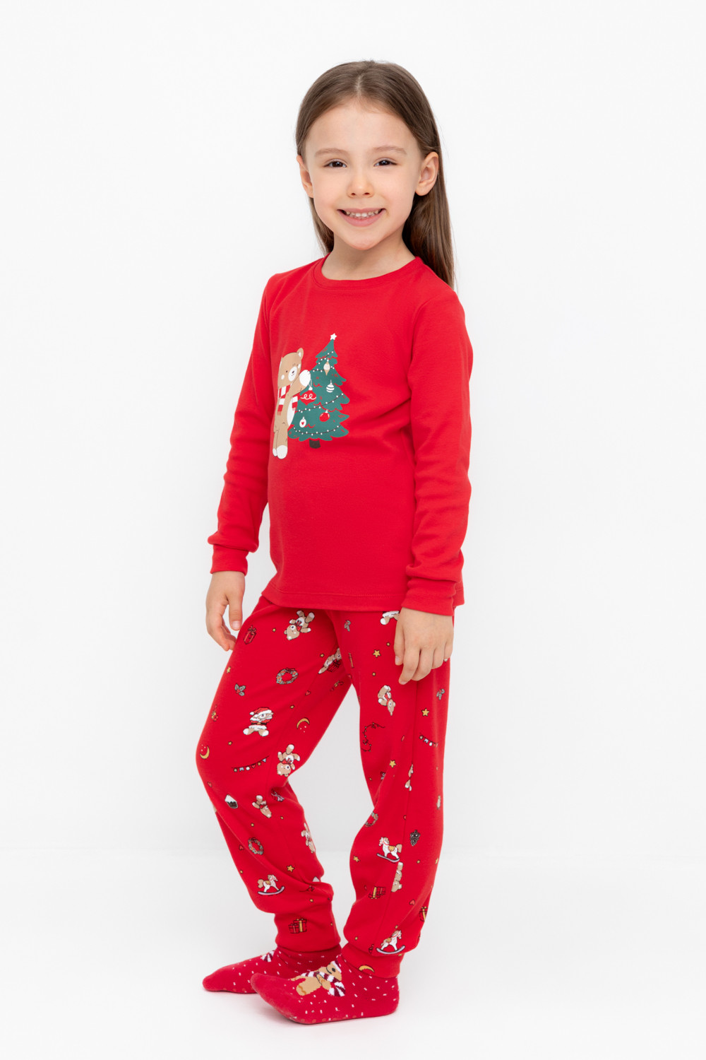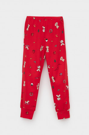 Трикотажный пижамный комплект из натурального хлопка. У джемпера длинные втачные рукава с мягкими манжетами. Брюки с удобным поясом на резинке и эластичными манжетами. Оригинальная набивка и принт выполнены из стойких, гипоаллергенных текстильных красителей. Все трикотажные полотна производятся в соответствии с нормами Швейцарского сертификата ЭкоТекс.