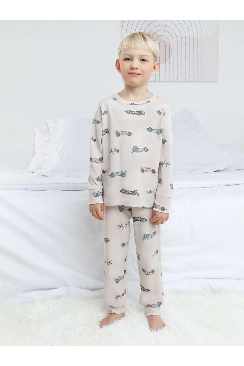 Трикотажная пижама из натурального хлопка. Джемпер с длинными втачными рукавами и брюки с эластичной резинкой в поясе. Мягкие манжеты на рукавах и по низу брюк. Оригинальная набивка выполнена из стойких текстильных гипоаллергенных красителей. Изделие сохраняет цвет и форму после многократных стирок. Все трикотажные полотна производятся в соответствии с нормами швейцарского сертификата ЭкоТекс.