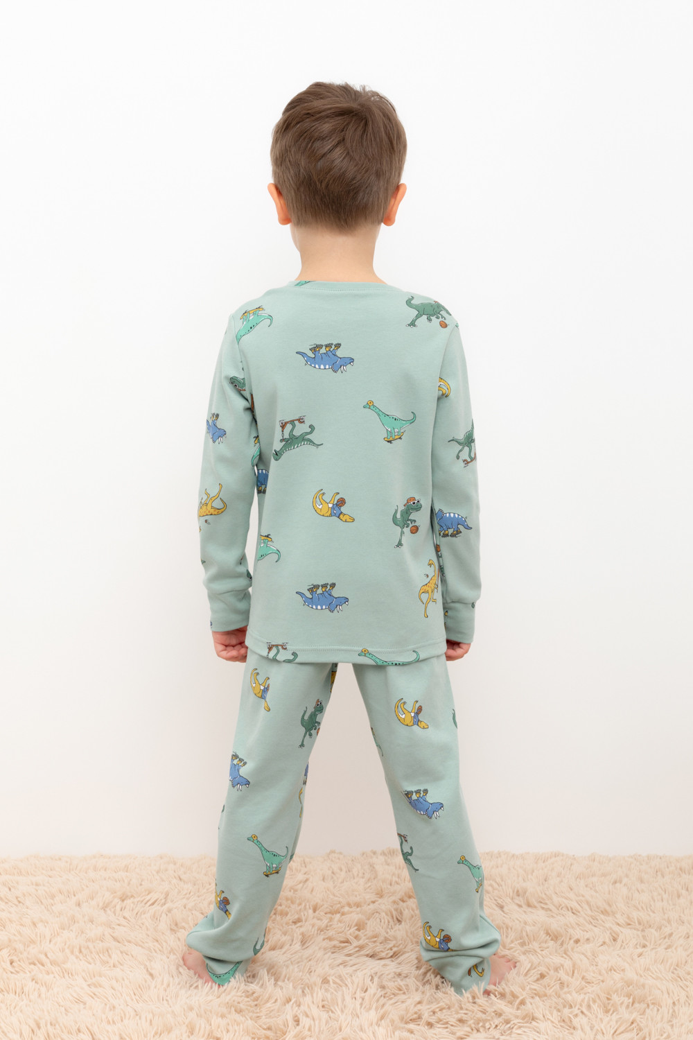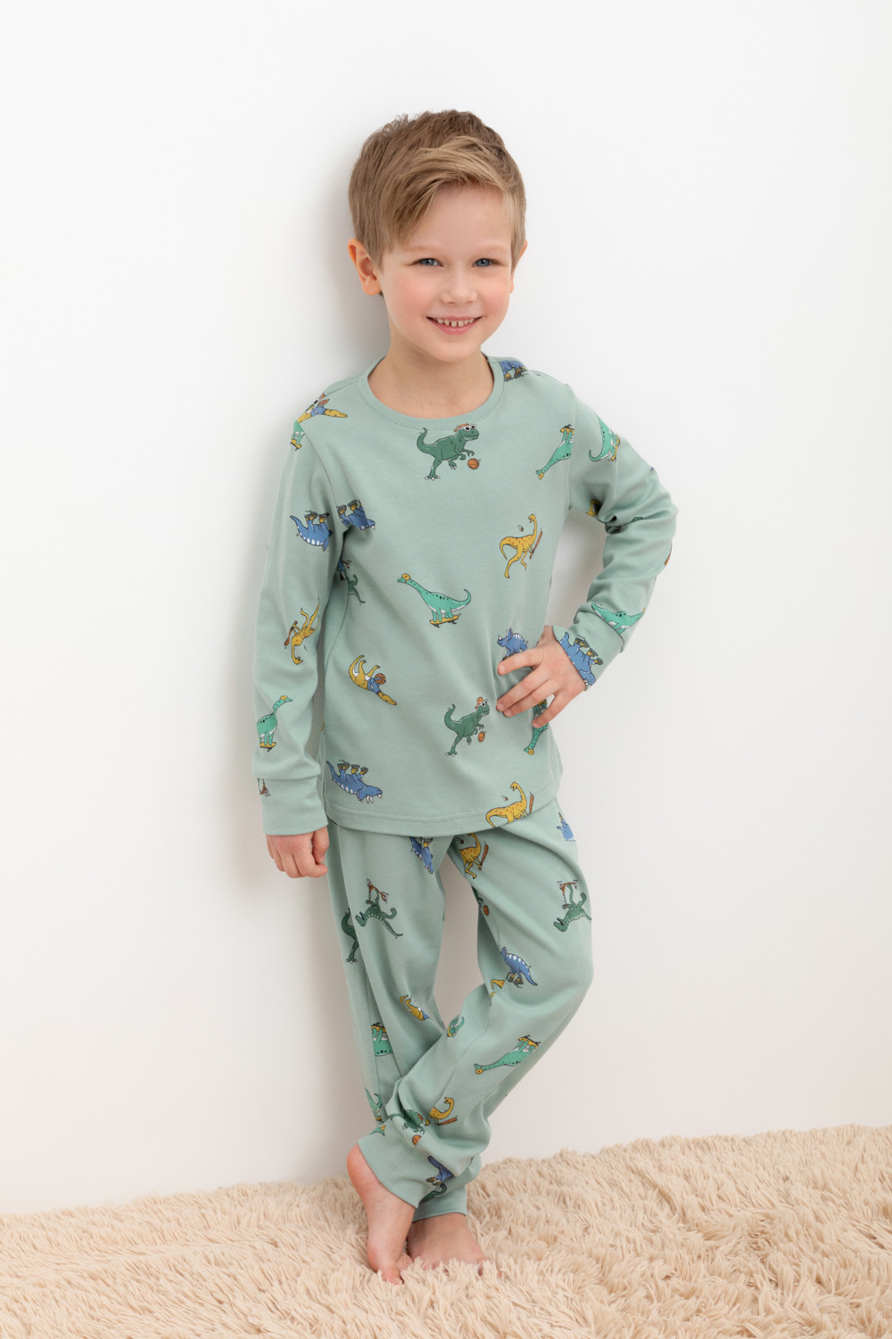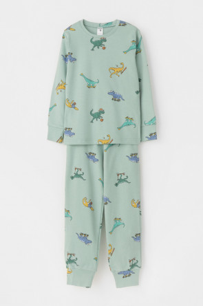 Трикотажная пижама из натурального хлопка. Джемпер с длинными рукавами. У брюк эластичный пояс на резинке. Оригинальная набивка выполнена из стойких, гипоаллергенных текстильных красителей. Пижама сохраняет цвет и форму после многократных стирок. Все трикотажные полотна производятся в соответсвии с нормами Швейцарского сертификата ЭкоТекс.