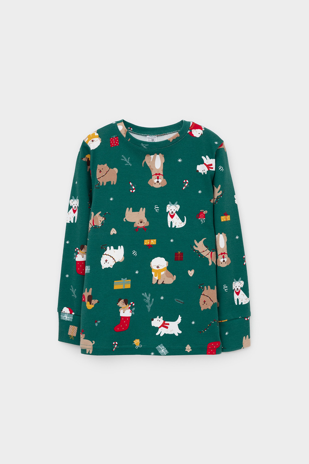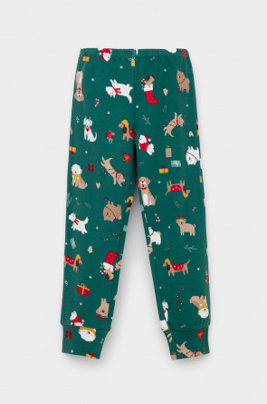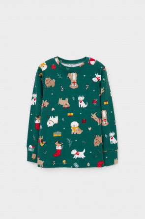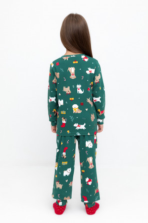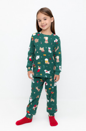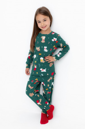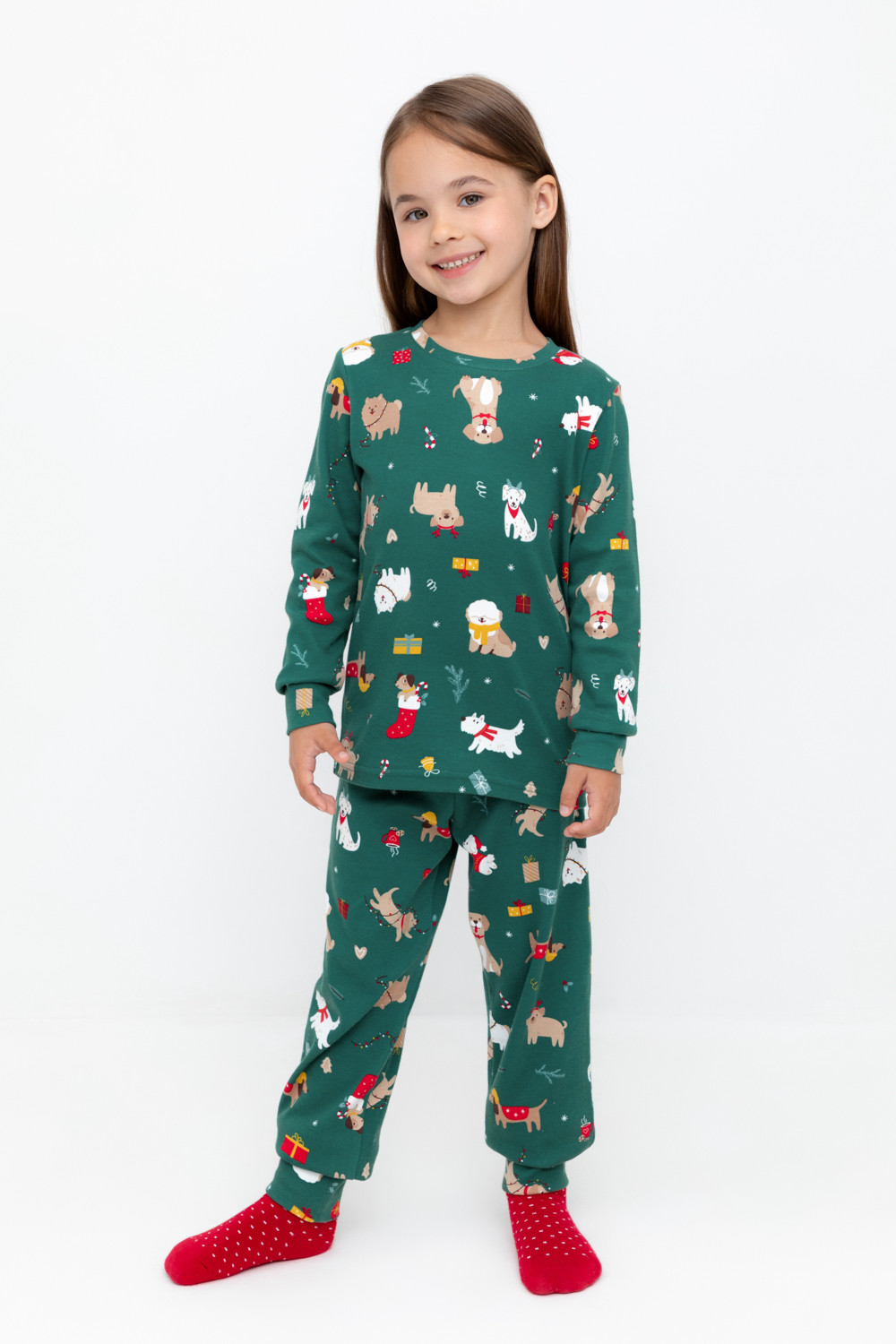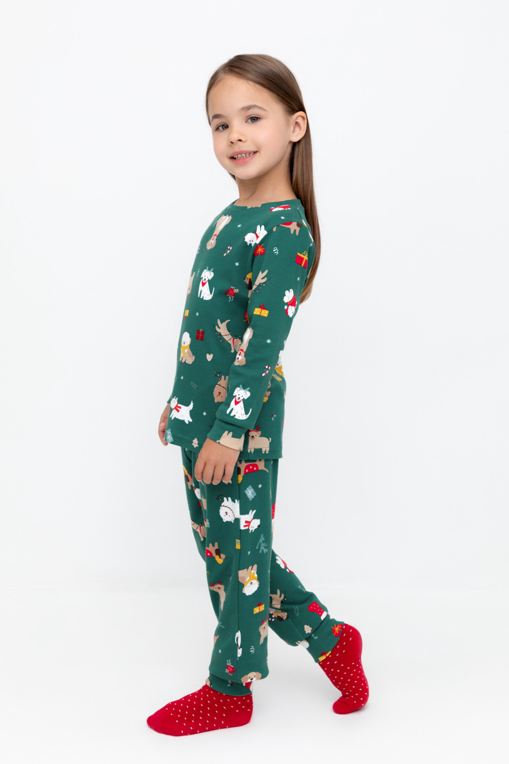 Трикотажный пижамный комплект из натурального хлопка. У джемпера длинные втачные рукава с мягкими манжетами. Брюки с удобным поясом на резинке и эластичными манжетами. Оригинальная набивка выполнена из стойких, гипоаллергенных текстильных красителей. Все трикотажные полотна производятся в соответствии с нормами Швейцарского сертификата ЭкоТекс.