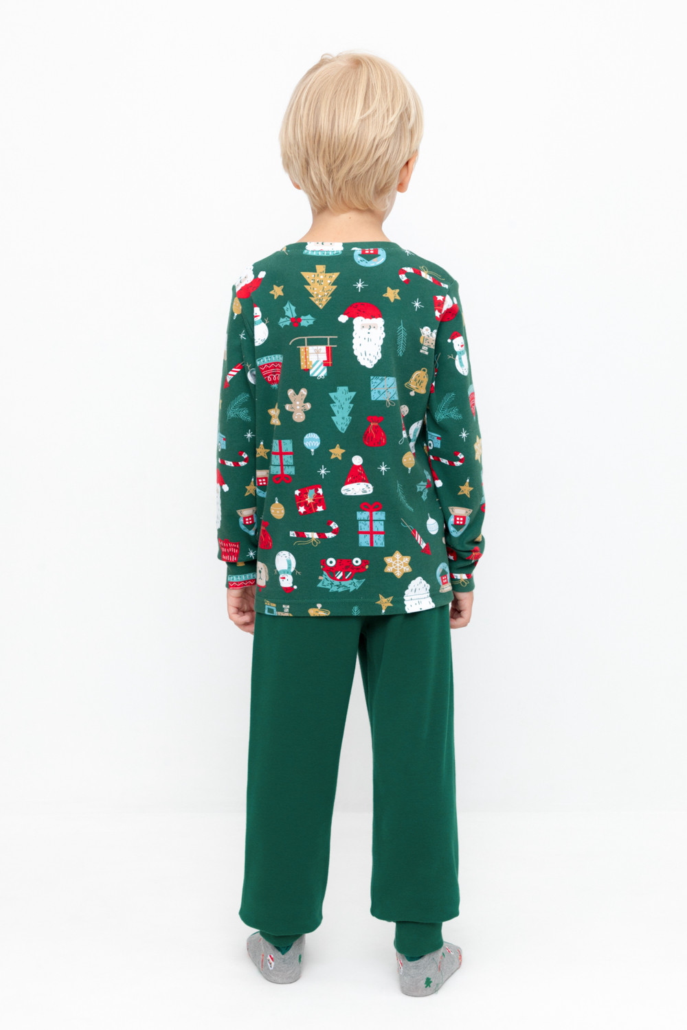 Трикотажный пижамный комплект из натурального хлопка. У джемпера длинные втачные рукава с мягкими манжетами. Брюки с удобным поясом на резинке и эластичными манжетами. Оригинальная набивка выполнена из стойких, гипоаллергенных текстильных красителей. Все трикотажные полотна производятся в соответствии с нормами Швейцарского сертификата ЭкоТекс.