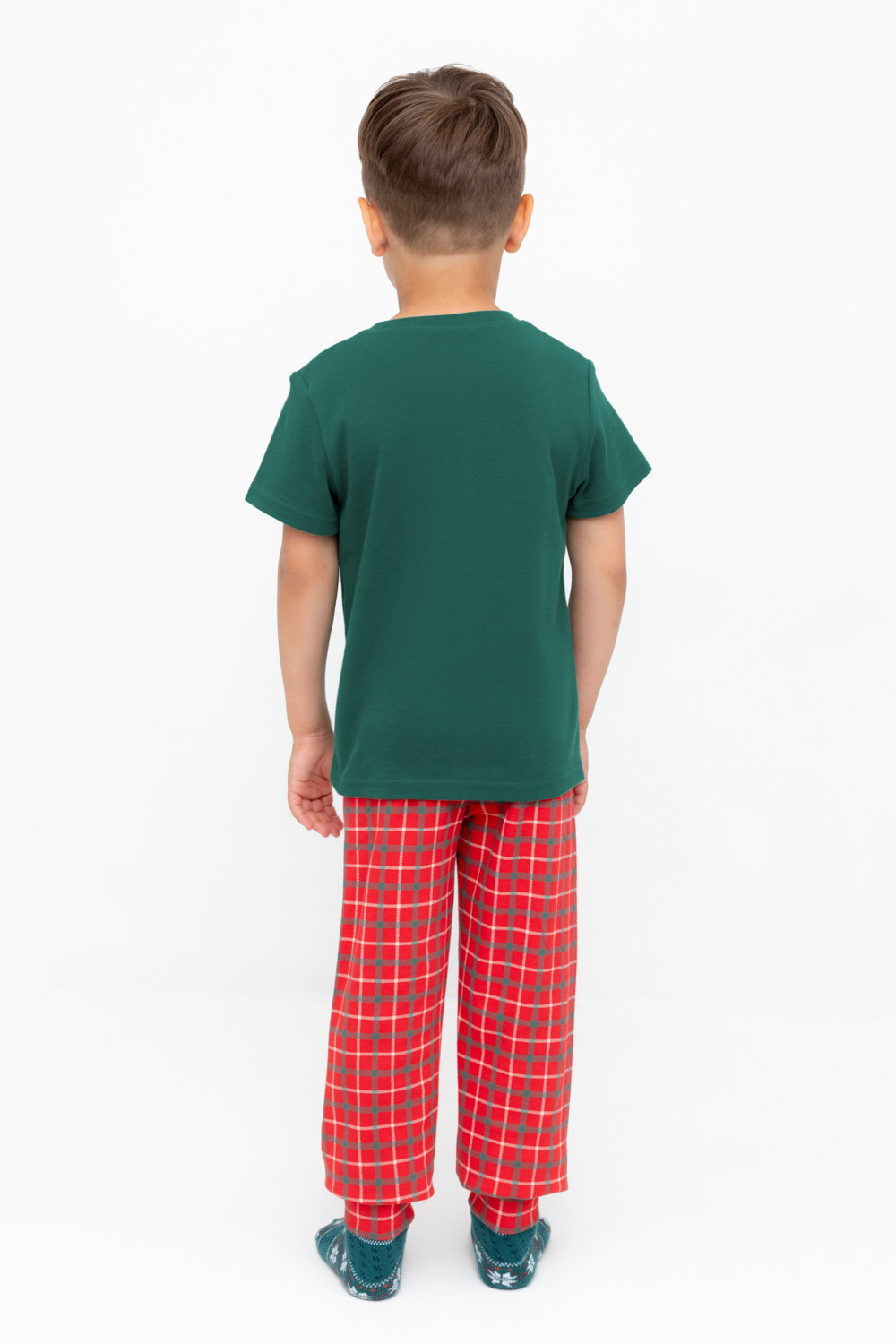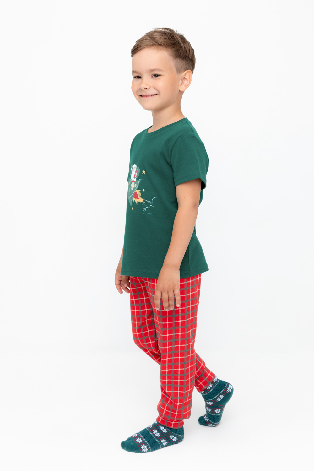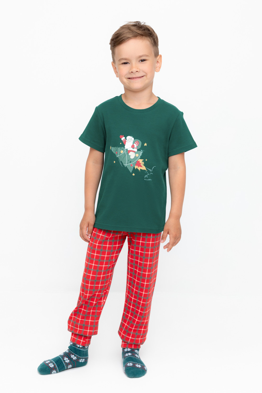 Трикотажная пижама из натурального хлопка. Однотонная футболка с короткими рукавами. Спереди принт. Штаны с набивным рисунком. Эластичные манжеты, цельнокроеный пояс, внутри плоская резинка. Оригинальные принт и набивка выполнены из стойких, гипоаллергенных текстильных красителей. Изделие сохраняет цвет и форму после многократных стирок. Все трикотажные полотна производятся в соответсвии с нормами Швейцарского сертификата ЭкоТекс.