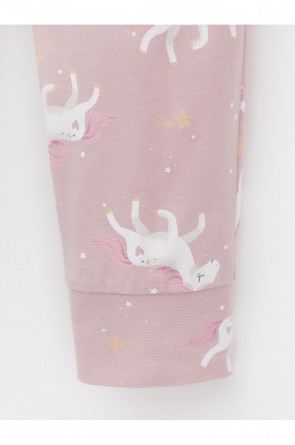 Пижама для девочки из натурального хлопка. Джемпер с длинными втачными рукавами и брюки с эластичной резинкой в поясе. Мягкие манжеты по низу брюк сделаны из материала в рубчик. Оригинальная набивка выполнена из стойких текстильных гипоаллергенных красителей. Изделие сохраняет цвет и форму после многократных стирок. Все трикотажные полотна производятся в соответствии с нормами швейцарского сертификата ЭкоТекс.