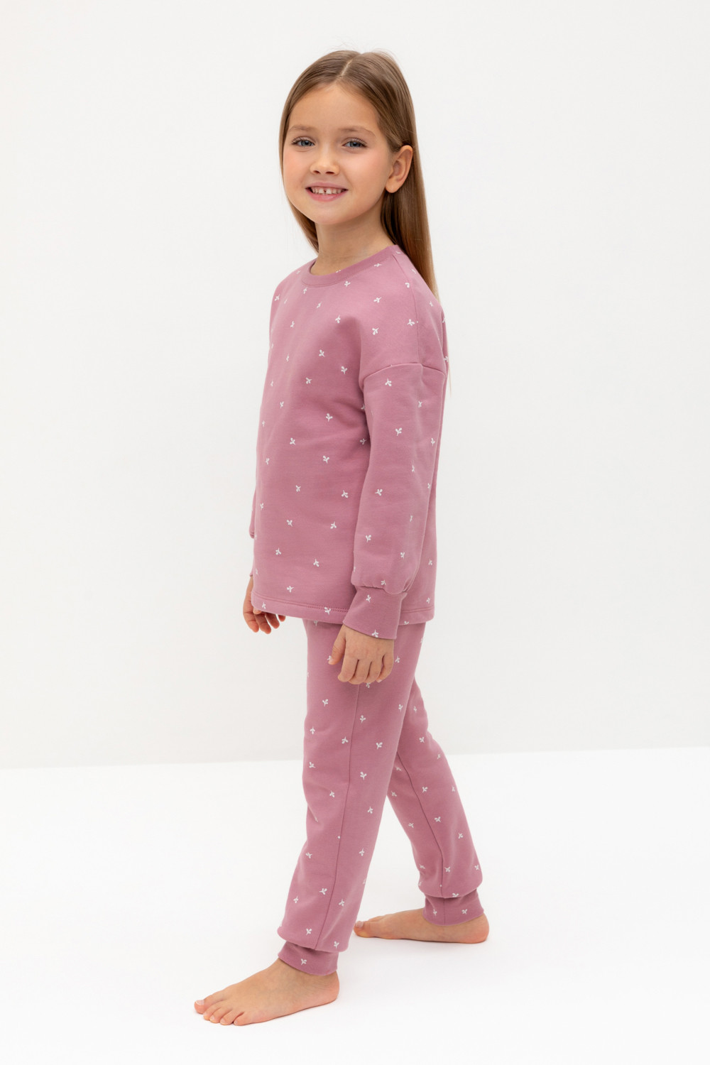 Трикотажная пижама с начёсом из натурального хлопка. Джемпер с длинными спущенными рукавами и брюки с эластичной резинкой в поясе. Мягкие манжеты на рукавах и по низу брюк. Оригинальная набивка выполнена из стойких гипоаллергенных текстильных гипоаллергенных красителей. Изделие сохраняет цвет и форму после многократных стирок. Все трикотажные полотна производятся в соответсвии с нормами швейцарского сертификата ЭкоТекс.