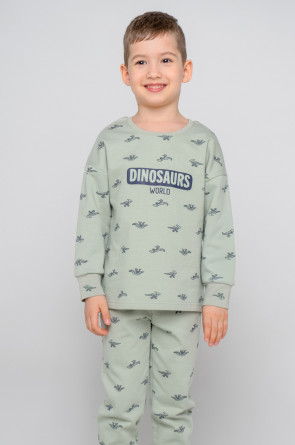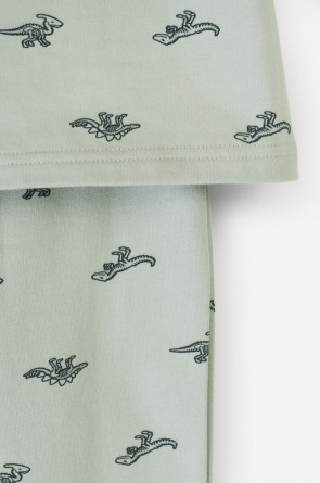 Трикотажный пижамный комплект из футера с начёсом, произведённого из натурального хлопка. У джемпера длинные рукава со спущенными плечами и эластичная мягкая горловина и манжеты. Брюки с удобным поясом на резинке, внизу манжеты. Оригинальная набивка и принт выполнены из стойких, гипоаллергенных текстильных красителей. Все трикотажные полотна производятся в соответствии с нормами Швейцарского сертификата ЭкоТекс.