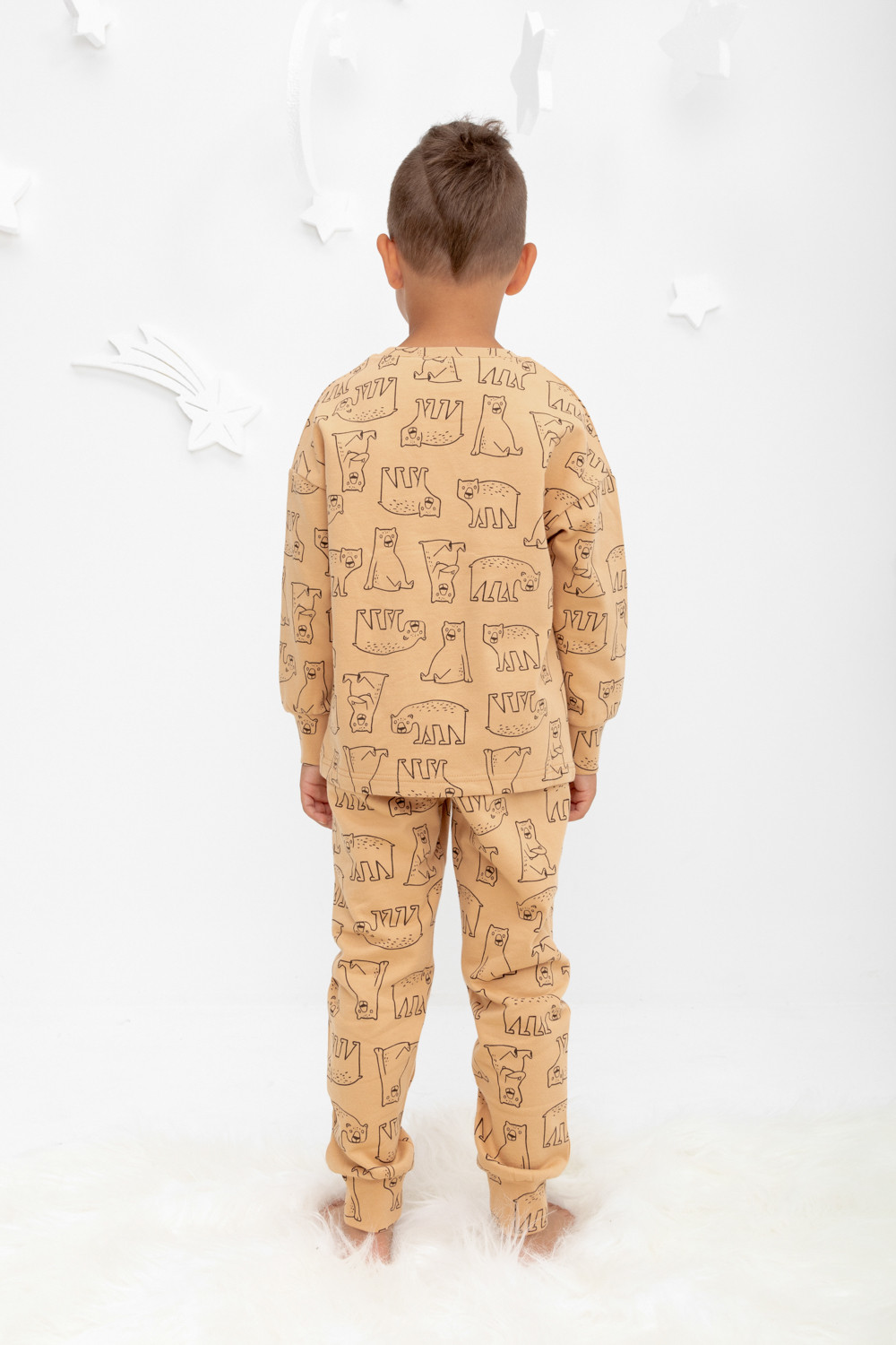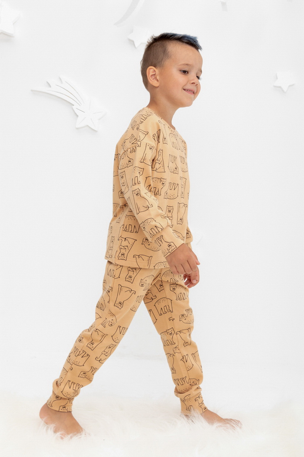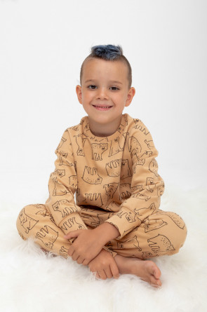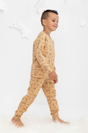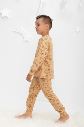 Трикотажный пижамный комплект из футера с начёсом, произведённого из натурального хлопка. У джемпера длинные рукава со спущенными плечами и эластичная мягкая горловина и манжеты. Брюки с удобным поясом на резинке, внизу манжеты. Оригинальная набивка выполнена из стойких, гипоаллергенных текстильных красителей. Все трикотажные полотна производятся в соответствии с нормами Швейцарского сертификата ЭкоТекс.