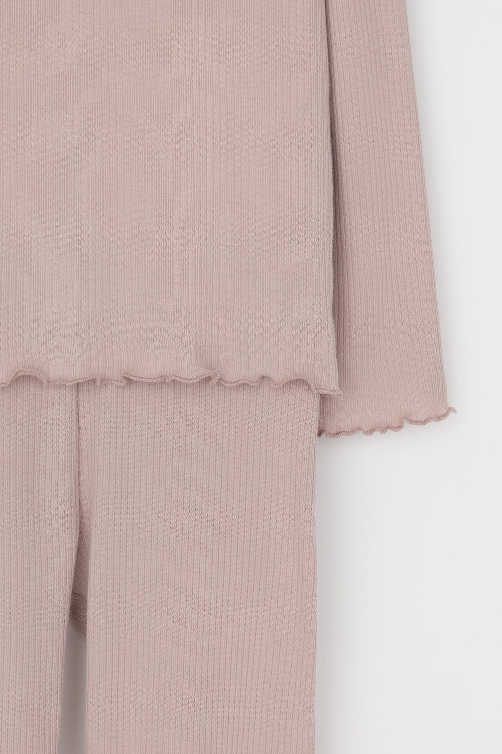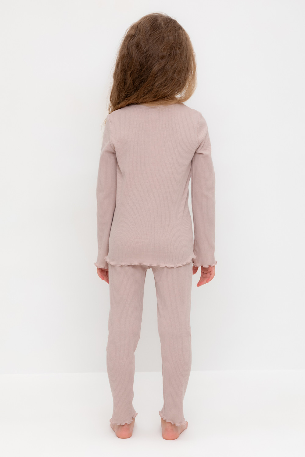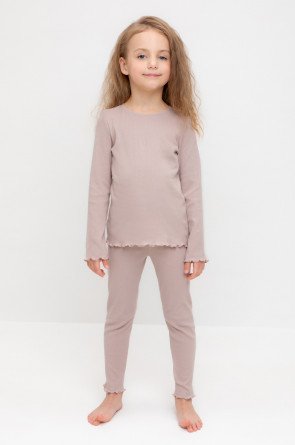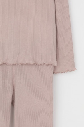 Трикотажная пижама в рубчик из натурального хлопка. Джемпер с длинными втачными рукавами. У лосин мягкий, эластичный пояс на резинке. Комплект сохраняет цвет и форму после многократных стирок. Все трикотажные полотна производятся в соответсвии с нормами Швейцарского сертификата ЭкоТекс.