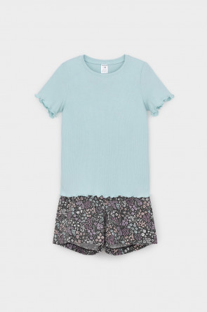 Трикотажная пижама из натурального хлопка. Футболка с короткими втачными рукавами изготовлена из эластичного трикотажа в рубчик. Шорты с эластичной резинкой в поясе выполнены из гладкого трикотажа супрем. Оригинальная набивка выполнена из стойких текстильных гипоаллергенных красителей. Изделие сохраняет цвет и форму после многократных стирок. Все трикотажные полотна производятся в соответсвии с нормами швейцарского сертификата ЭкоТекс.