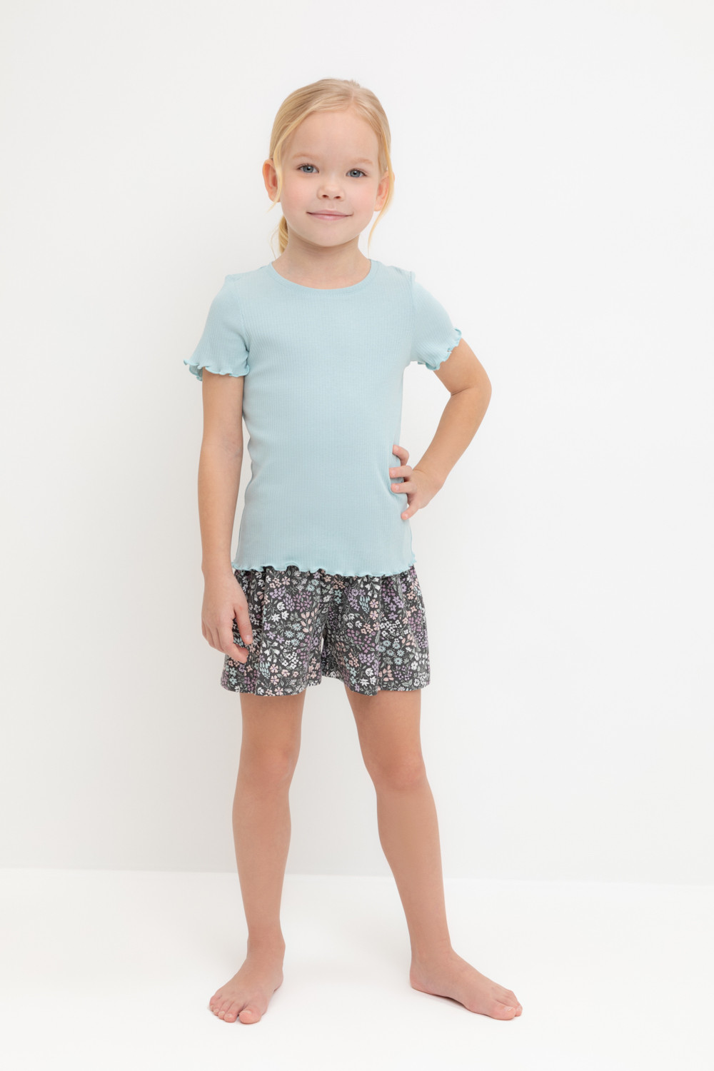 Трикотажная пижама из натурального хлопка. Футболка с короткими втачными рукавами изготовлена из эластичного трикотажа в рубчик. Шорты с эластичной резинкой в поясе выполнены из гладкого трикотажа супрем. Оригинальная набивка выполнена из стойких текстильных гипоаллергенных красителей. Изделие сохраняет цвет и форму после многократных стирок. Все трикотажные полотна производятся в соответсвии с нормами швейцарского сертификата ЭкоТекс.