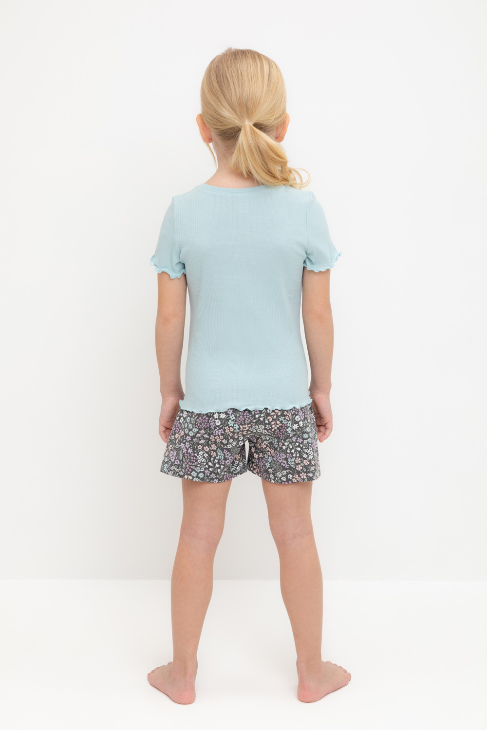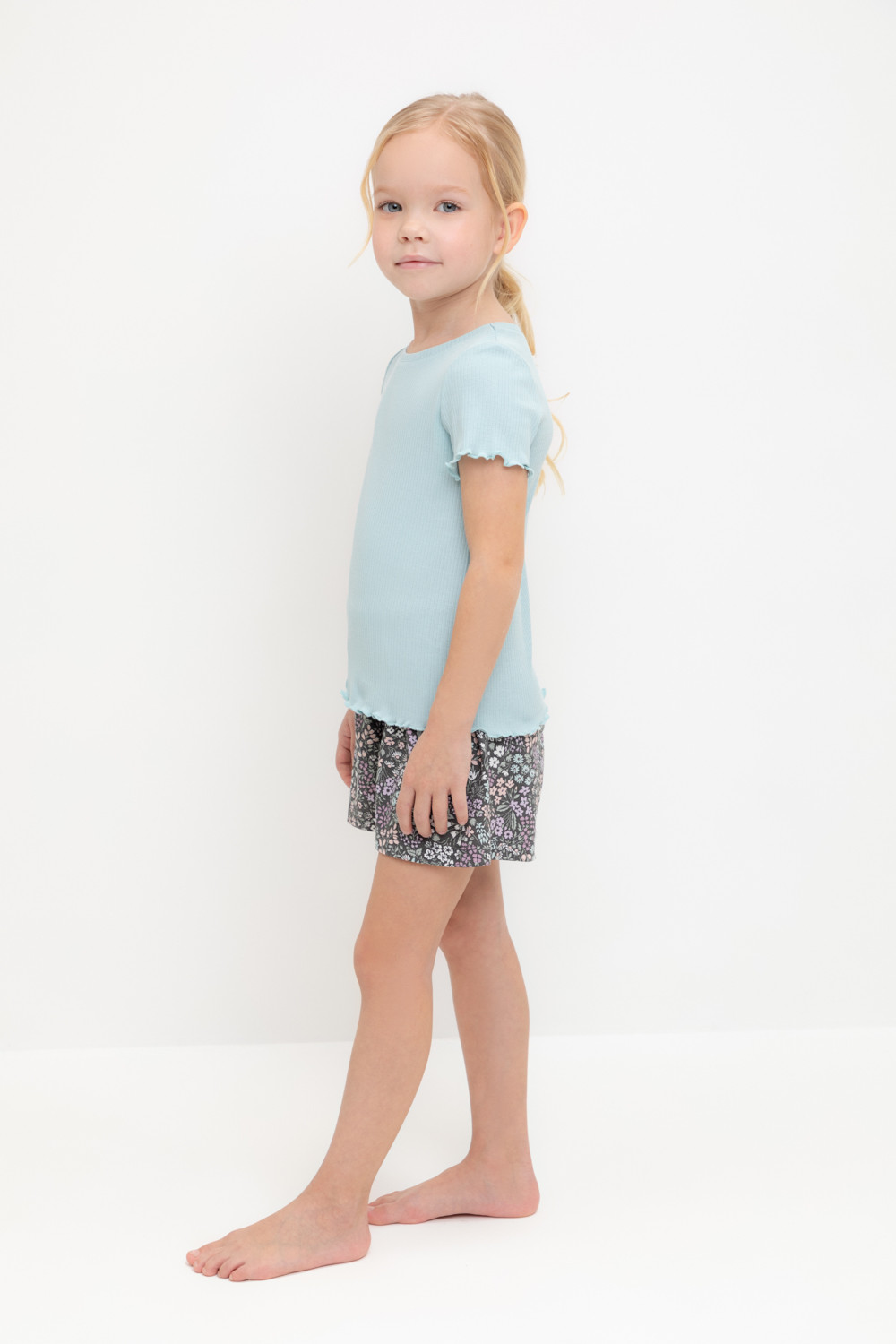 Трикотажная пижама из натурального хлопка. Футболка с короткими втачными рукавами изготовлена из эластичного трикотажа в рубчик. Шорты с эластичной резинкой в поясе выполнены из гладкого трикотажа супрем. Оригинальная набивка выполнена из стойких текстильных гипоаллергенных красителей. Изделие сохраняет цвет и форму после многократных стирок. Все трикотажные полотна производятся в соответсвии с нормами швейцарского сертификата ЭкоТекс.