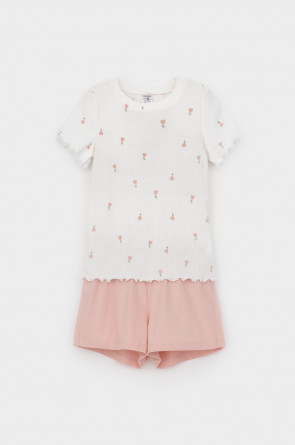 Трикотажная пижама из натурального хлопка. Футболка с короткими втачными рукавами изготовлена из эластичного трикотажа в рубчик. Шорты с эластичной резинкой в поясе выполнены из гладкого трикотажа супрем. Оригинальная набивка выполнена из стойких текстильных гипоаллергенных красителей. Изделие сохраняет цвет и форму после многократных стирок. Все трикотажные полотна производятся в соответсвии с нормами швейцарского сертификата ЭкоТекс.