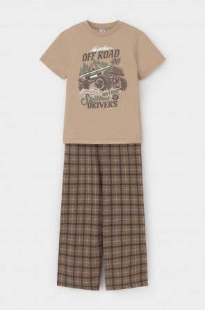 Трикотажная пижама из натурального хлопка. Футболка с короткими втачными рукавами и прямые брюки с эластичной резинкой в поясе. Оригинальные набивка и принт выполнены из стойких гипоаллергенных текстильных гипоаллергенных красителей. Изделие сохраняет цвет и форму после многократных стирок. Все трикотажные полотна производятся в соответсвии с нормами швейцарского сертификата ЭкоТекс.