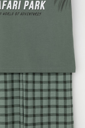 Трикотажная пижама из натурального хлопка. Футболка с короткими втачными рукавами и прямые брюки с эластичной резинкой в поясе. Оригинальные набивка и принт выполнены из стойких гипоаллергенных текстильных гипоаллергенных красителей. Изделие сохраняет цвет и форму после многократных стирок. Все трикотажные полотна производятся в соответсвии с нормами швейцарского сертификата ЭкоТекс.