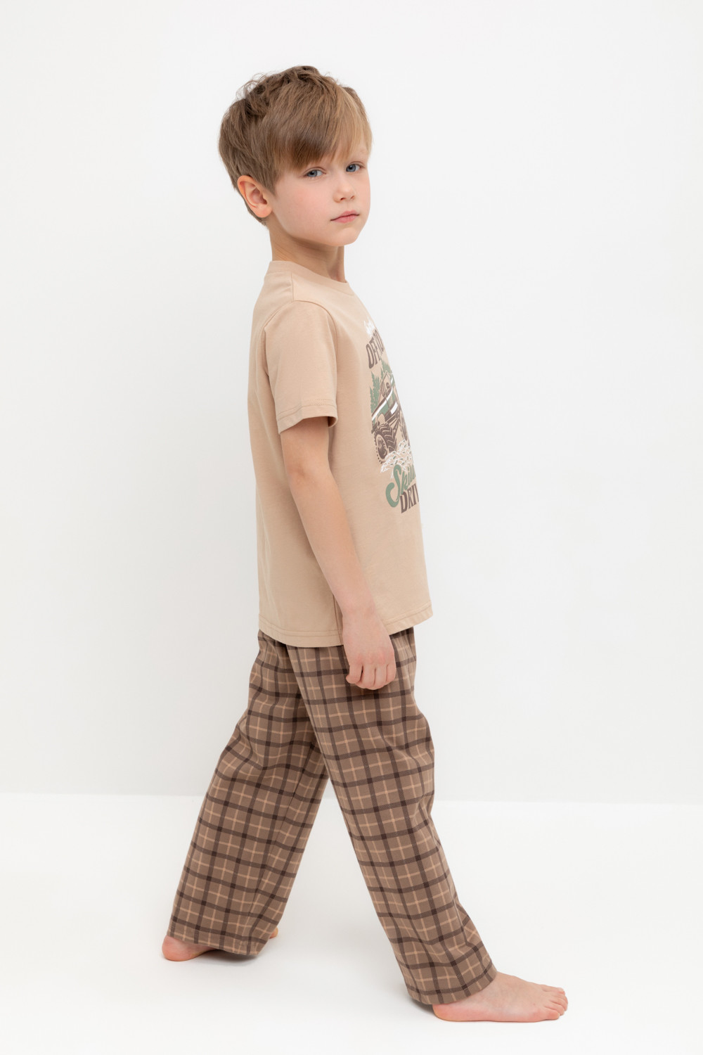 Трикотажная пижама из натурального хлопка. Футболка с короткими втачными рукавами и прямые брюки с эластичной резинкой в поясе. Оригинальные набивка и принт выполнены из стойких гипоаллергенных текстильных гипоаллергенных красителей. Изделие сохраняет цвет и форму после многократных стирок. Все трикотажные полотна производятся в соответсвии с нормами швейцарского сертификата ЭкоТекс.