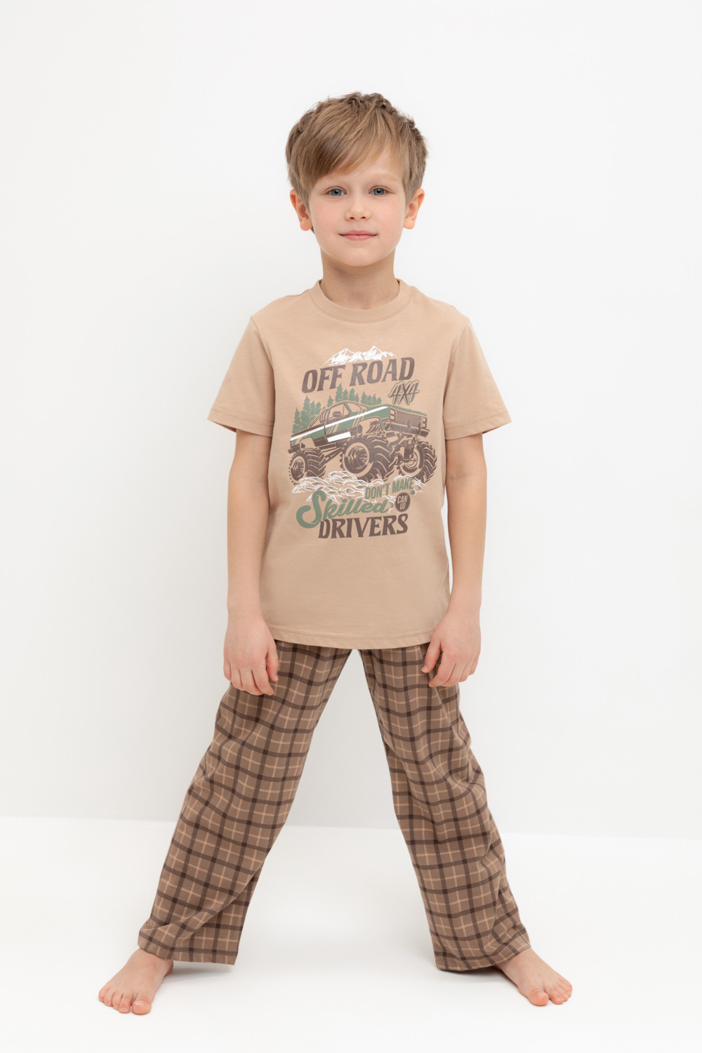 Трикотажная пижама из натурального хлопка. Футболка с короткими втачными рукавами и прямые брюки с эластичной резинкой в поясе. Оригинальные набивка и принт выполнены из стойких гипоаллергенных текстильных гипоаллергенных красителей. Изделие сохраняет цвет и форму после многократных стирок. Все трикотажные полотна производятся в соответсвии с нормами швейцарского сертификата ЭкоТекс.