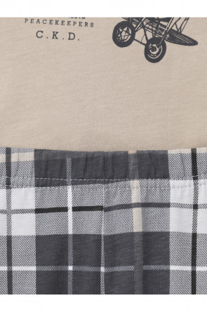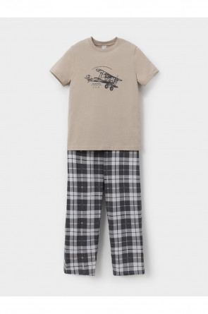 Пижама для мальчика из натурального хлопка. Футболка с короткими втачными рукавами и прямые брюки с эластичной резинкой в поясе. Оригинальная набивка и принт выполнены из стойких текстильных гипоаллергенных красителей. Изделие сохраняет цвет и форму после многократных стирок. Все трикотажные полотна производятся в соответствии с нормами швейцарского сертификата ЭкоТекс.