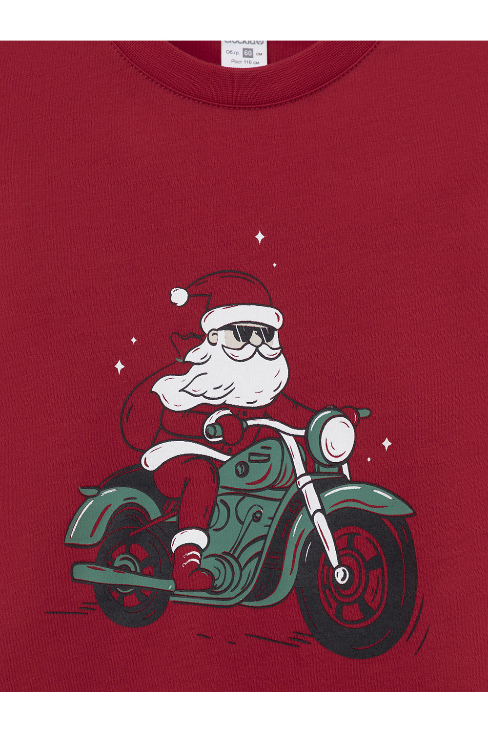 Новогодняя пижама из натурального хлопка для мальчика. Футболка с короткими втачными рукавами и прямые брюки с эластичной резинкой в поясе. Пижама отлично подойдёт для создания уютных домашних образов или в качестве подарка на Новый год и Рождество. Оригинальная набивка и принт выполнены из стойких текстильных гипоаллергенных красителей. Изделие сохраняет цвет и форму после многократных стирок. Все трикотажные полотна производятся в соответствии с нормами швейцарского сертификата ЭкоТекс.