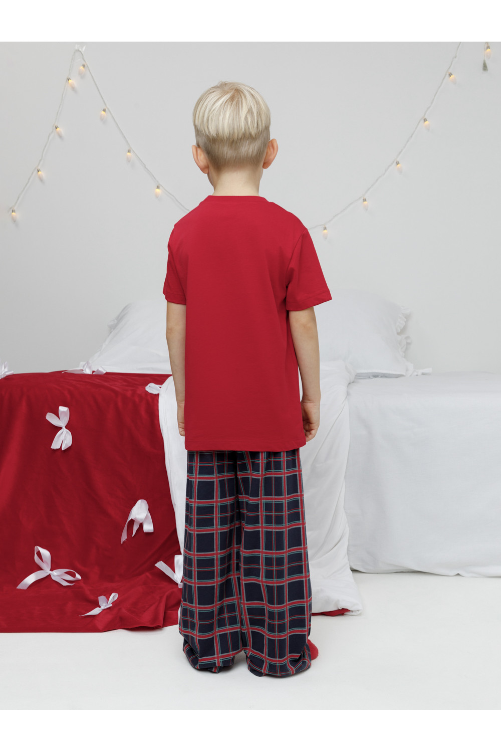 Новогодняя пижама из натурального хлопка для мальчика. Футболка с короткими втачными рукавами и прямые брюки с эластичной резинкой в поясе. Пижама отлично подойдёт для создания уютных домашних образов или в качестве подарка на Новый год и Рождество. Оригинальная набивка и принт выполнены из стойких текстильных гипоаллергенных красителей. Изделие сохраняет цвет и форму после многократных стирок. Все трикотажные полотна производятся в соответствии с нормами швейцарского сертификата ЭкоТекс.