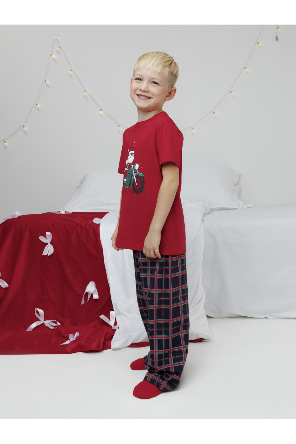 Новогодняя пижама из натурального хлопка для мальчика. Футболка с короткими втачными рукавами и прямые брюки с эластичной резинкой в поясе. Пижама отлично подойдёт для создания уютных домашних образов или в качестве подарка на Новый год и Рождество. Оригинальная набивка и принт выполнены из стойких текстильных гипоаллергенных красителей. Изделие сохраняет цвет и форму после многократных стирок. Все трикотажные полотна производятся в соответствии с нормами швейцарского сертификата ЭкоТекс.