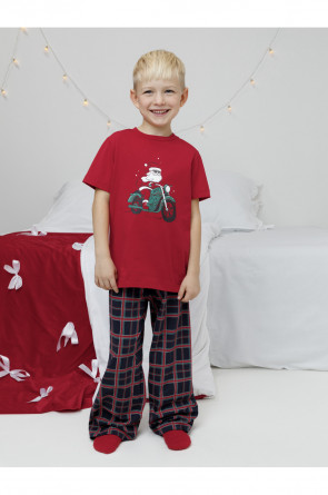 Новогодняя пижама из натурального хлопка для мальчика. Футболка с короткими втачными рукавами и прямые брюки с эластичной резинкой в поясе. Пижама отлично подойдёт для создания уютных домашних образов или в качестве подарка на Новый год и Рождество. Оригинальная набивка и принт выполнены из стойких текстильных гипоаллергенных красителей. Изделие сохраняет цвет и форму после многократных стирок. Все трикотажные полотна производятся в соответствии с нормами швейцарского сертификата ЭкоТекс.