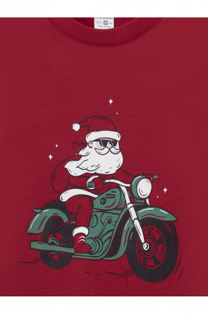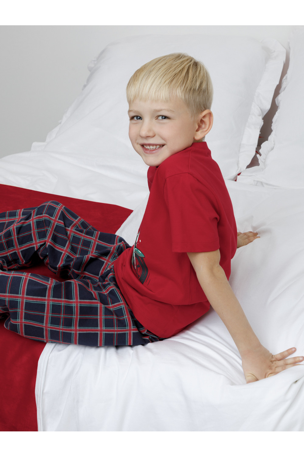 Новогодняя пижама из натурального хлопка для мальчика. Футболка с короткими втачными рукавами и прямые брюки с эластичной резинкой в поясе. Пижама отлично подойдёт для создания уютных домашних образов или в качестве подарка на Новый год и Рождество. Оригинальная набивка и принт выполнены из стойких текстильных гипоаллергенных красителей. Изделие сохраняет цвет и форму после многократных стирок. Все трикотажные полотна производятся в соответствии с нормами швейцарского сертификата ЭкоТекс.