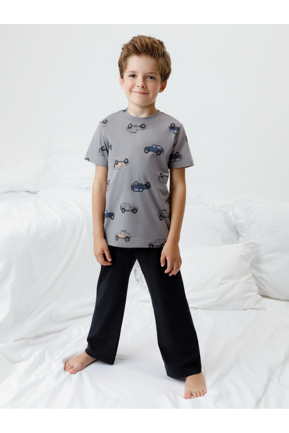 Пижама для мальчика из натурального хлопка. Футболка с короткими втачными рукавами и прямые брюки с эластичной резинкой в поясе. Оригинальная набивка и принт выполнены из стойких текстильных гипоаллергенных красителей. Изделие сохраняет цвет и форму после многократных стирок. Все трикотажные полотна производятся в соответствии с нормами швейцарского сертификата ЭкоТекс.