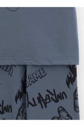 Пижама для мальчика из натурального хлопка. Футболка с короткими втачными рукавами и прямые брюки с эластичной резинкой в поясе. Оригинальная набивка и принт выполнены из стойких текстильных гипоаллергенных красителей. Изделие сохраняет цвет и форму после многократных стирок. Все трикотажные полотна производятся в соответствии с нормами швейцарского сертификата ЭкоТекс.