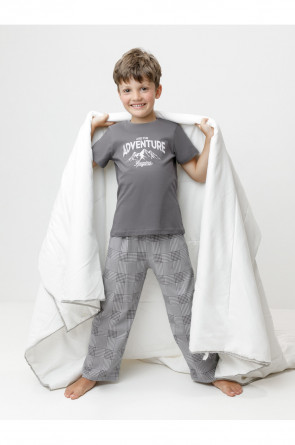 Трикотажная пижама из натурального хлопка. Футболка с короткими втачными рукавами и прямые брюки с эластичной резинкой в поясе. Оригинальные набивка и принт выполнены из стойких гипоаллергенных текстильных гипоаллергенных красителей. Изделие сохраняет цвет и форму после многократных стирок. Все трикотажные полотна производятся в соответсвии с нормами швейцарского сертификата ЭкоТекс.