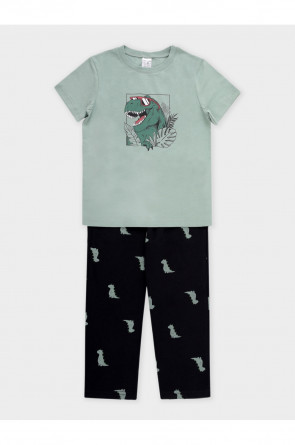 Пижама для мальчика из натурального хлопка. Футболка с короткими втачными рукавами и прямые брюки с эластичной резинкой в поясе. Оригинальная набивка и принт выполнены из стойких текстильных гипоаллергенных красителей. Изделие сохраняет цвет и форму после многократных стирок. Все трикотажные полотна производятся в соответствии с нормами швейцарского сертификата ЭкоТекс.