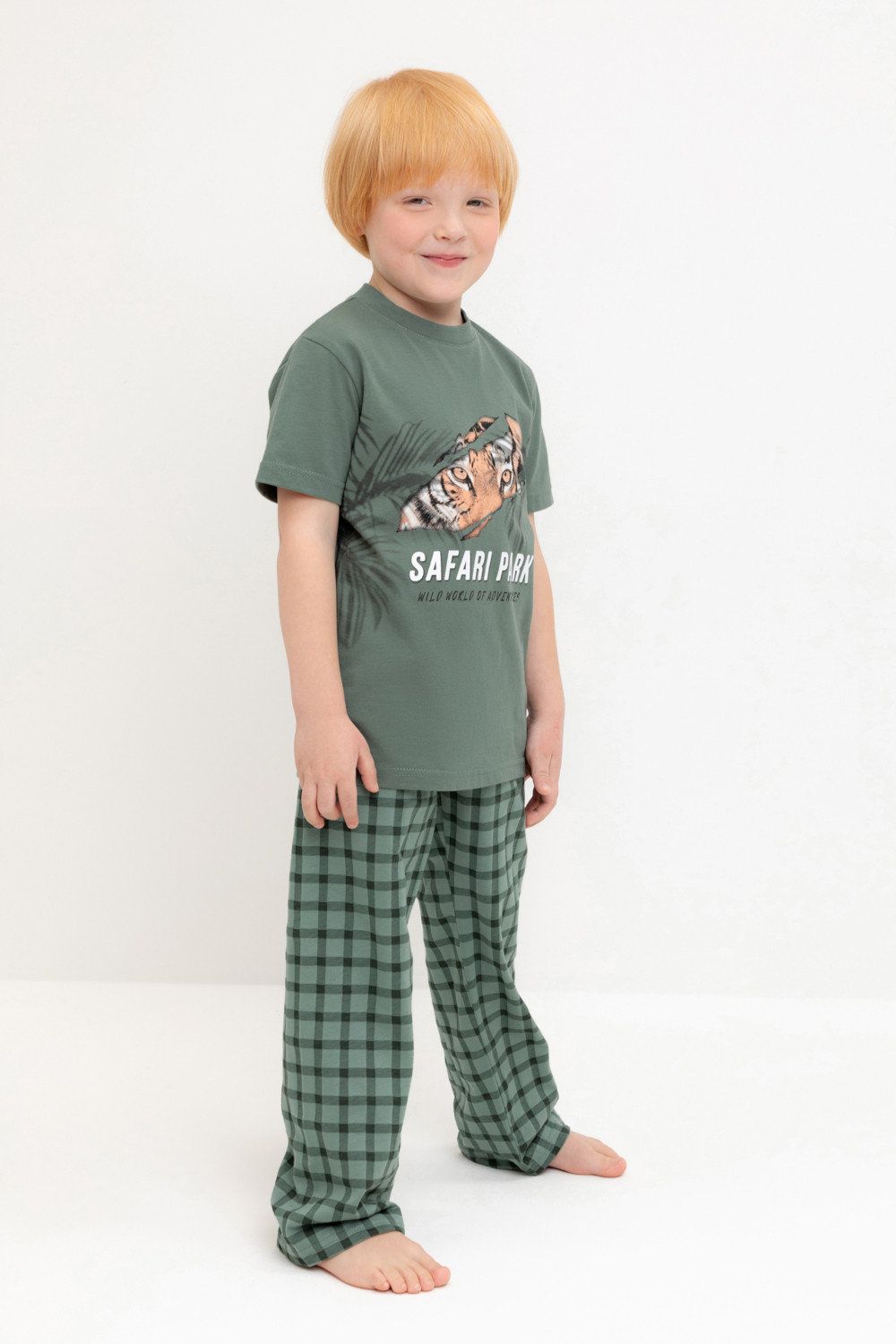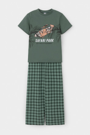 Трикотажная пижама из натурального хлопка. Футболка с короткими втачными рукавами и прямые брюки с эластичной резинкой в поясе. Оригинальные набивка и принт выполнены из стойких гипоаллергенных текстильных гипоаллергенных красителей. Изделие сохраняет цвет и форму после многократных стирок. Все трикотажные полотна производятся в соответсвии с нормами швейцарского сертификата ЭкоТекс.