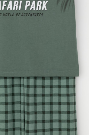 Трикотажная пижама из натурального хлопка. Футболка с короткими втачными рукавами и прямые брюки с эластичной резинкой в поясе. Оригинальные набивка и принт выполнены из стойких гипоаллергенных текстильных гипоаллергенных красителей. Изделие сохраняет цвет и форму после многократных стирок. Все трикотажные полотна производятся в соответсвии с нормами швейцарского сертификата ЭкоТекс.