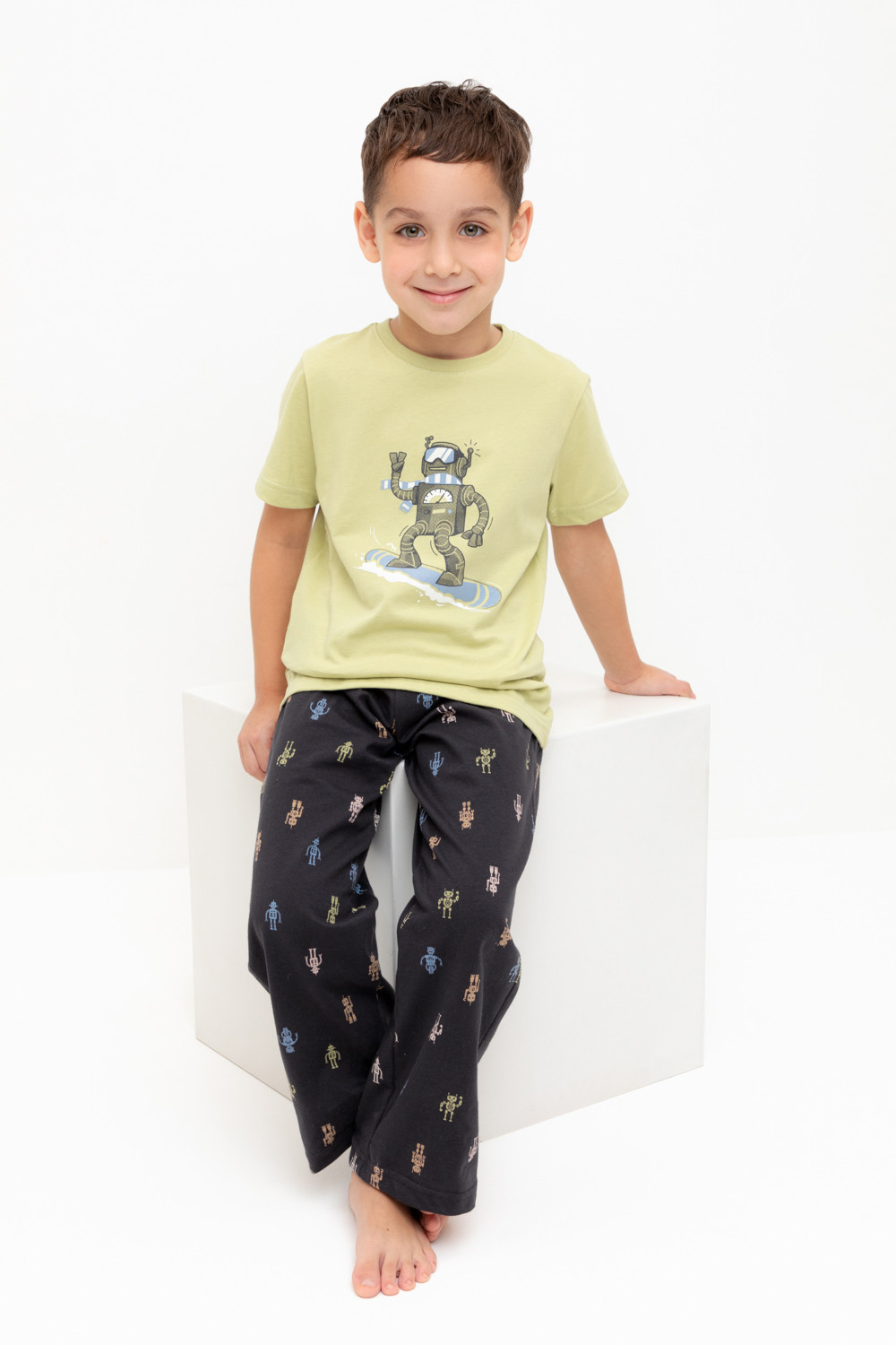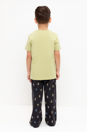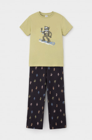 Трикотажная пижама из натурального хлопка. Футболка с короткими рукавами с принтом. У брюк эластичный пояс на резинке. Оригинальные принт и набивка выполнены из стойких, гипоаллергенных текстильных красителей. Пижама сохраняет цвет и форму после многократных стирок. Все трикотажные полотна производятся в соответсвии с нормами Швейцарского сертификата ЭкоТекс.