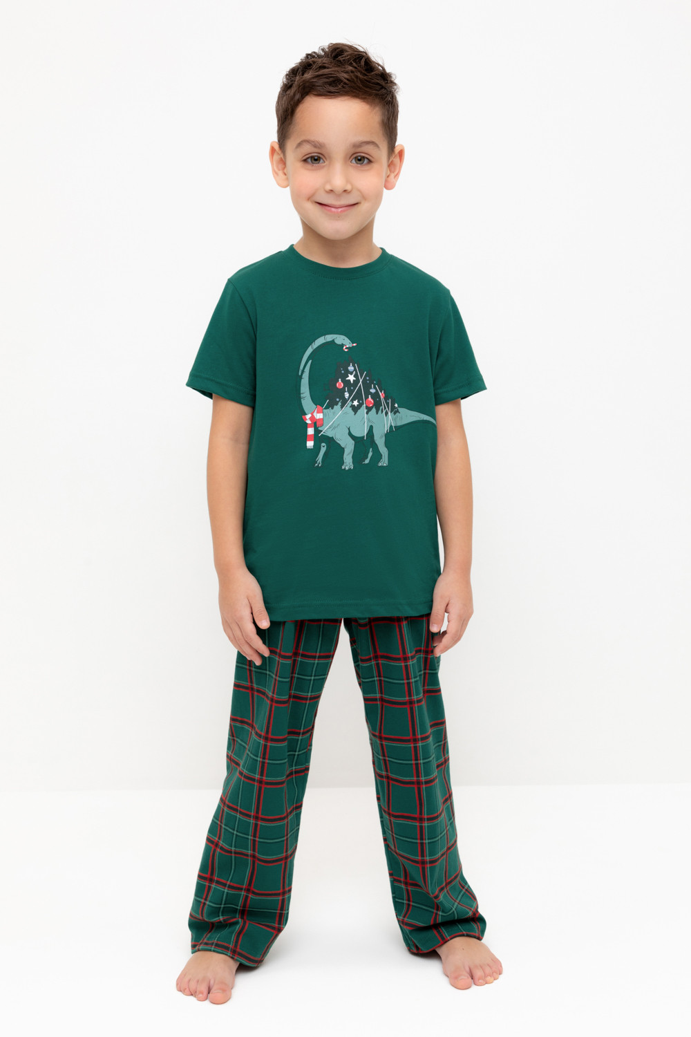 Трикотажная пижама из натурального хлопка. Футболка с короткими рукавами с принтом. У брюк эластичный пояс на резинке. Оригинальные принт и набивка выполнены из стойких, гипоаллергенных текстильных красителей. Пижама сохраняет цвет и форму после многократных стирок. Все трикотажные полотна производятся в соответсвии с нормами Швейцарского сертификата ЭкоТекс.