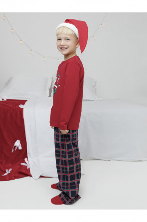 Новогодняя пижама из натурального хлопка для мальчика. Джемпер с длинными втачными рукавами и прямые брюки с эластичной резинкой в поясе. Пижама отлично подойдёт для создания уютных домашних образов или в качестве подарка на Новый год и Рождество. Оригинальная набивка и принт выполнены из стойких текстильных гипоаллергенных красителей. Изделие сохраняет цвет и форму после многократных стирок. Все трикотажные полотна производятся в соответствии с нормами швейцарского сертификата ЭкоТекс.