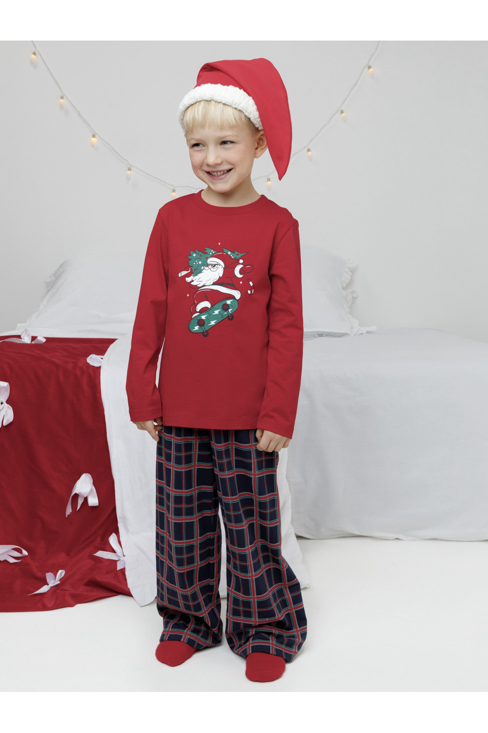 Новогодняя пижама из натурального хлопка для мальчика. Джемпер с длинными втачными рукавами и прямые брюки с эластичной резинкой в поясе. Пижама отлично подойдёт для создания уютных домашних образов или в качестве подарка на Новый год и Рождество. Оригинальная набивка и принт выполнены из стойких текстильных гипоаллергенных красителей. Изделие сохраняет цвет и форму после многократных стирок. Все трикотажные полотна производятся в соответствии с нормами швейцарского сертификата ЭкоТекс.