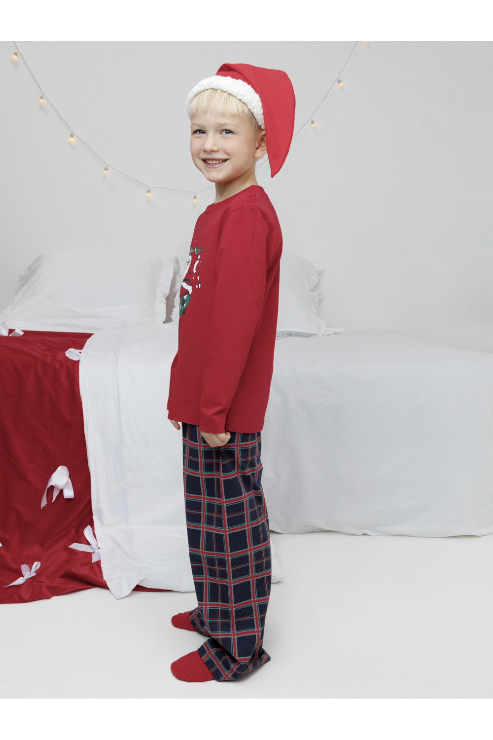 Новогодняя пижама из натурального хлопка для мальчика. Джемпер с длинными втачными рукавами и прямые брюки с эластичной резинкой в поясе. Пижама отлично подойдёт для создания уютных домашних образов или в качестве подарка на Новый год и Рождество. Оригинальная набивка и принт выполнены из стойких текстильных гипоаллергенных красителей. Изделие сохраняет цвет и форму после многократных стирок. Все трикотажные полотна производятся в соответствии с нормами швейцарского сертификата ЭкоТекс.