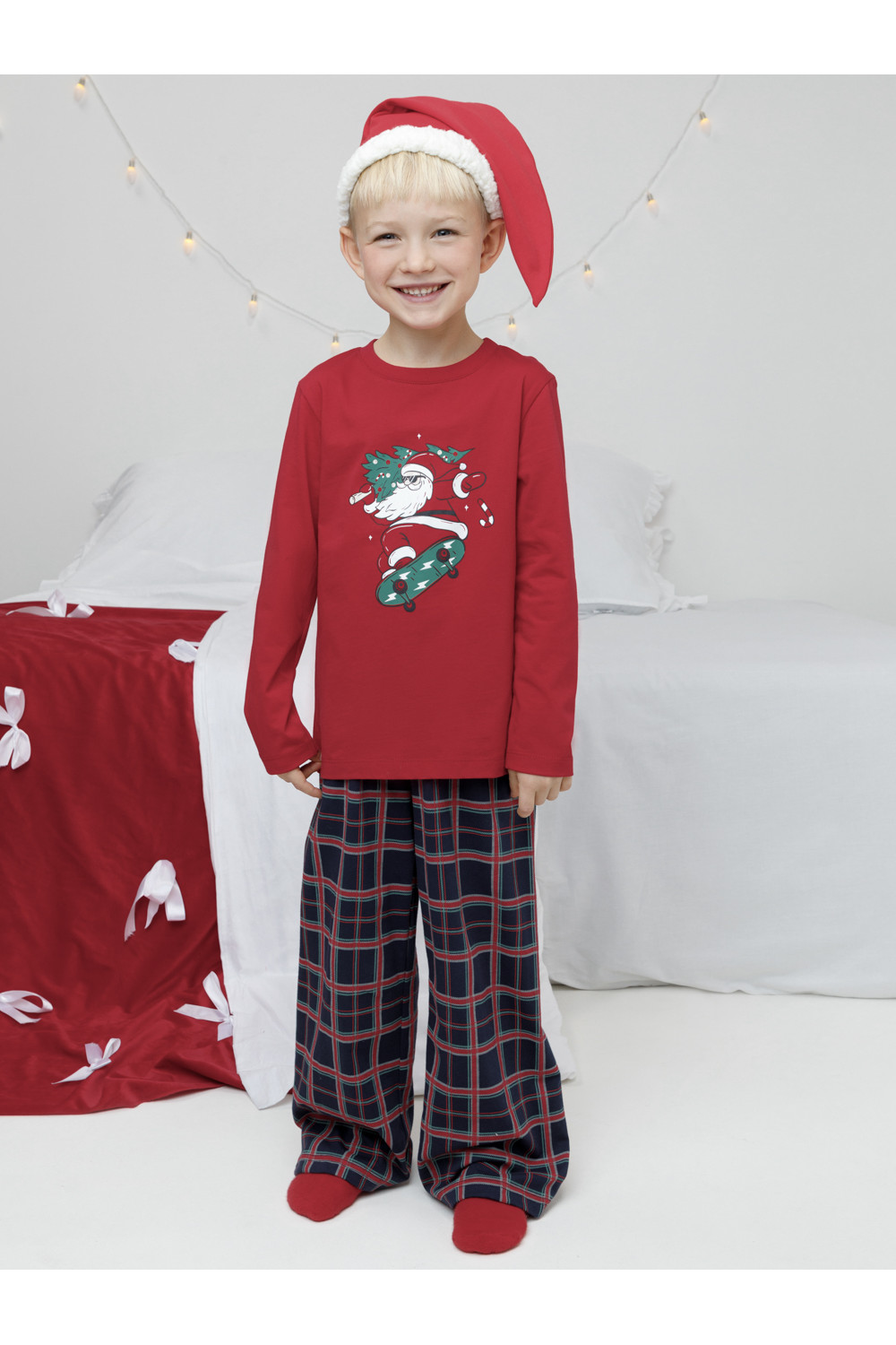 Новогодняя пижама из натурального хлопка для мальчика. Джемпер с длинными втачными рукавами и прямые брюки с эластичной резинкой в поясе. Пижама отлично подойдёт для создания уютных домашних образов или в качестве подарка на Новый год и Рождество. Оригинальная набивка и принт выполнены из стойких текстильных гипоаллергенных красителей. Изделие сохраняет цвет и форму после многократных стирок. Все трикотажные полотна производятся в соответствии с нормами швейцарского сертификата ЭкоТекс.